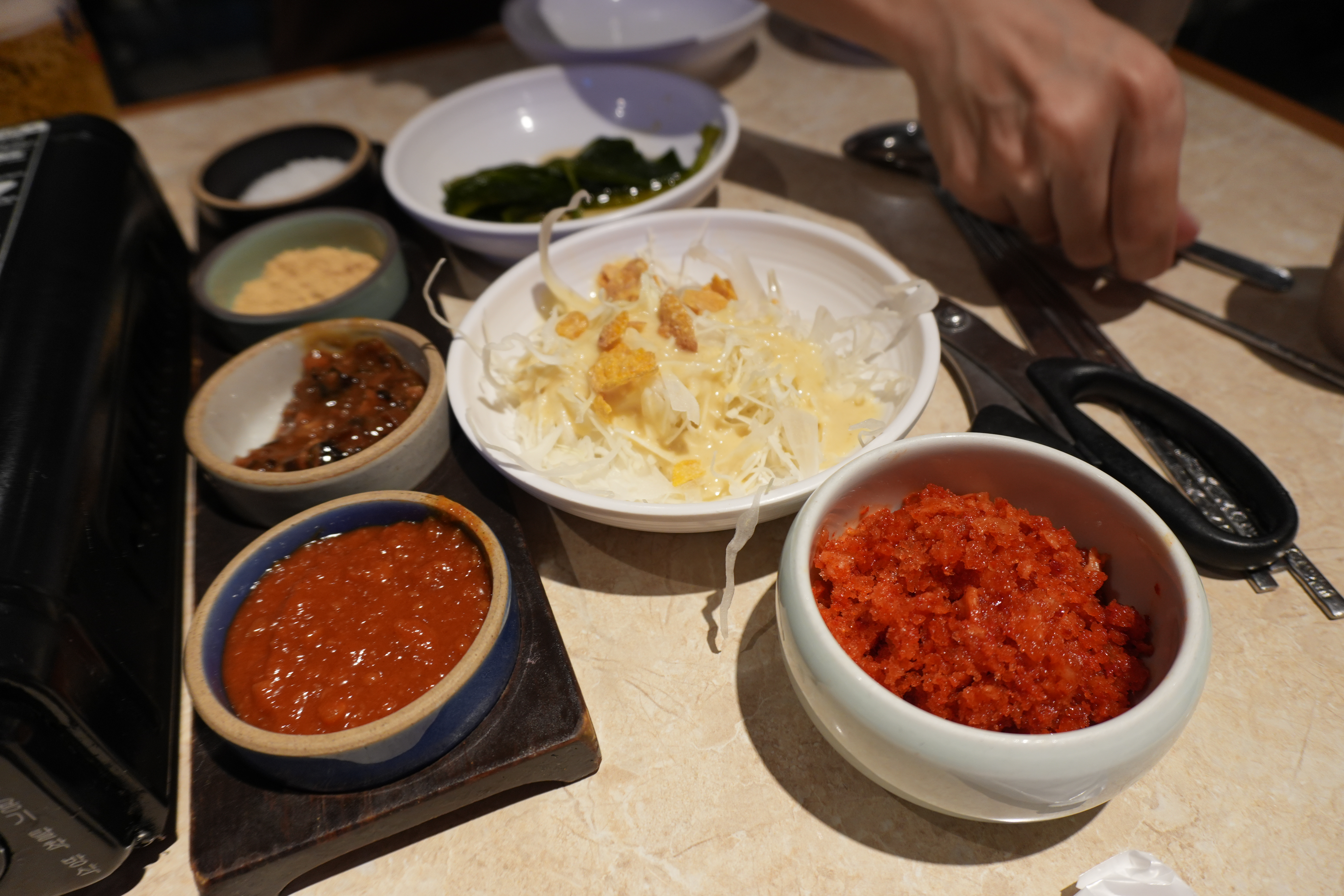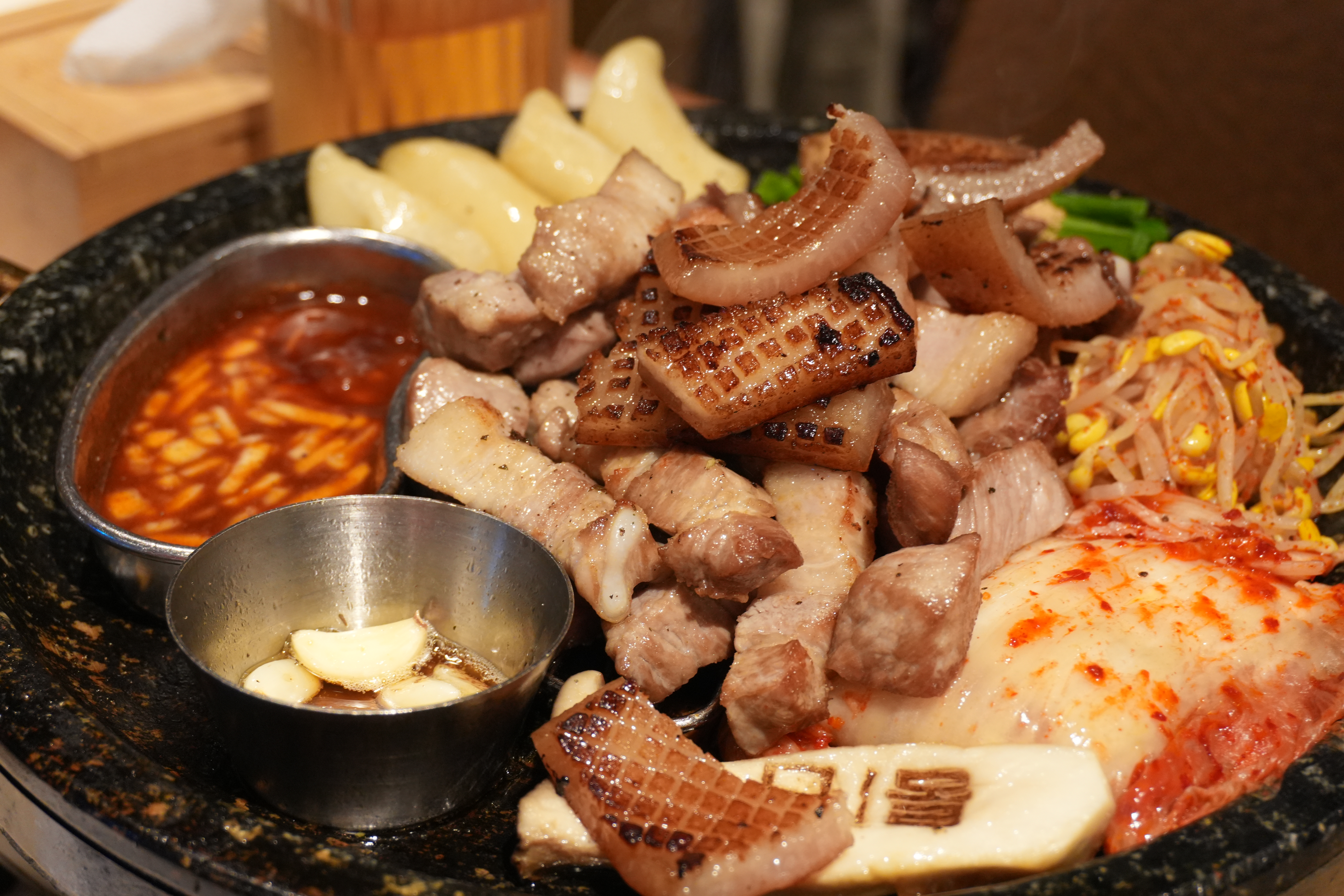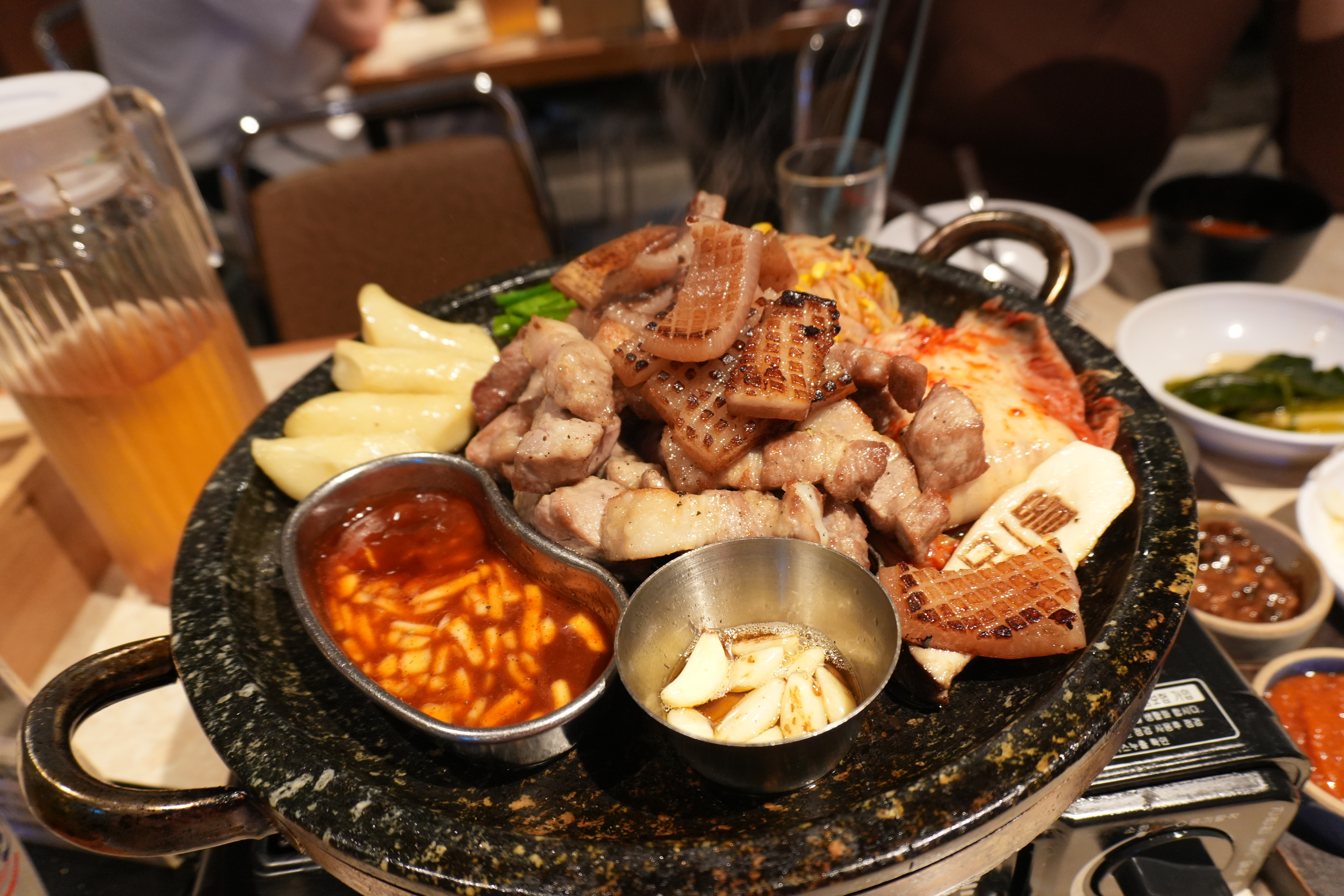 두툼한 삼겹살과 목살이 기본이고 그 옆에 벌집껍데기, 콩나물, 김치, 버섯, 떡까지 같이 구워져 나와서 풍성하게 곁들일 수 있다. 고기 질 자체가 좋아서 굳이 소스 안 찍어도 감칠맛이 좋았고, 입안에서 그냥 풀어질 정도로 부드러웠다.