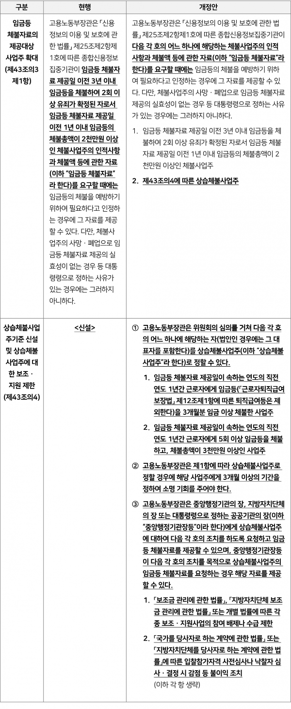 상습체불사업주 기준 신설 1년간 3개월분 또는 5회·3천만원 이상 체불 체불 기업 명확한 규정 및 관리
