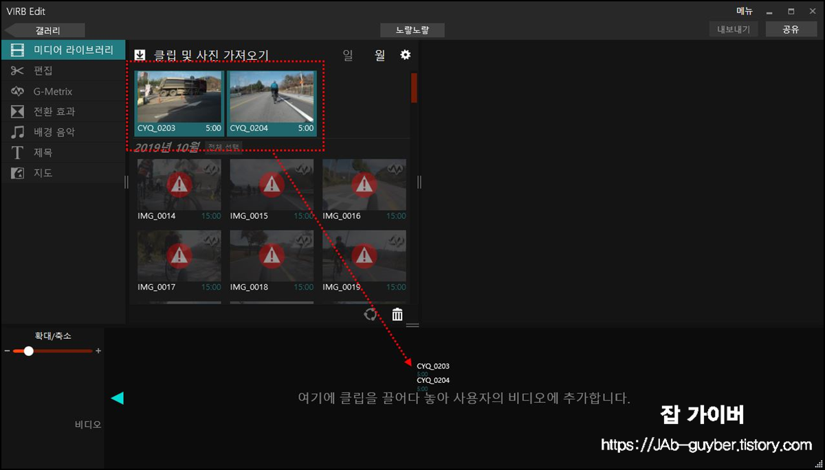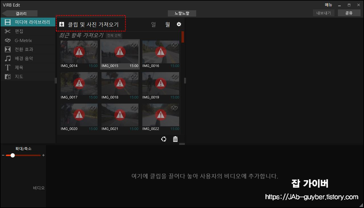 클립 및 사진 가져오기 선택해 촬영된 동영상을 가져옵니다.