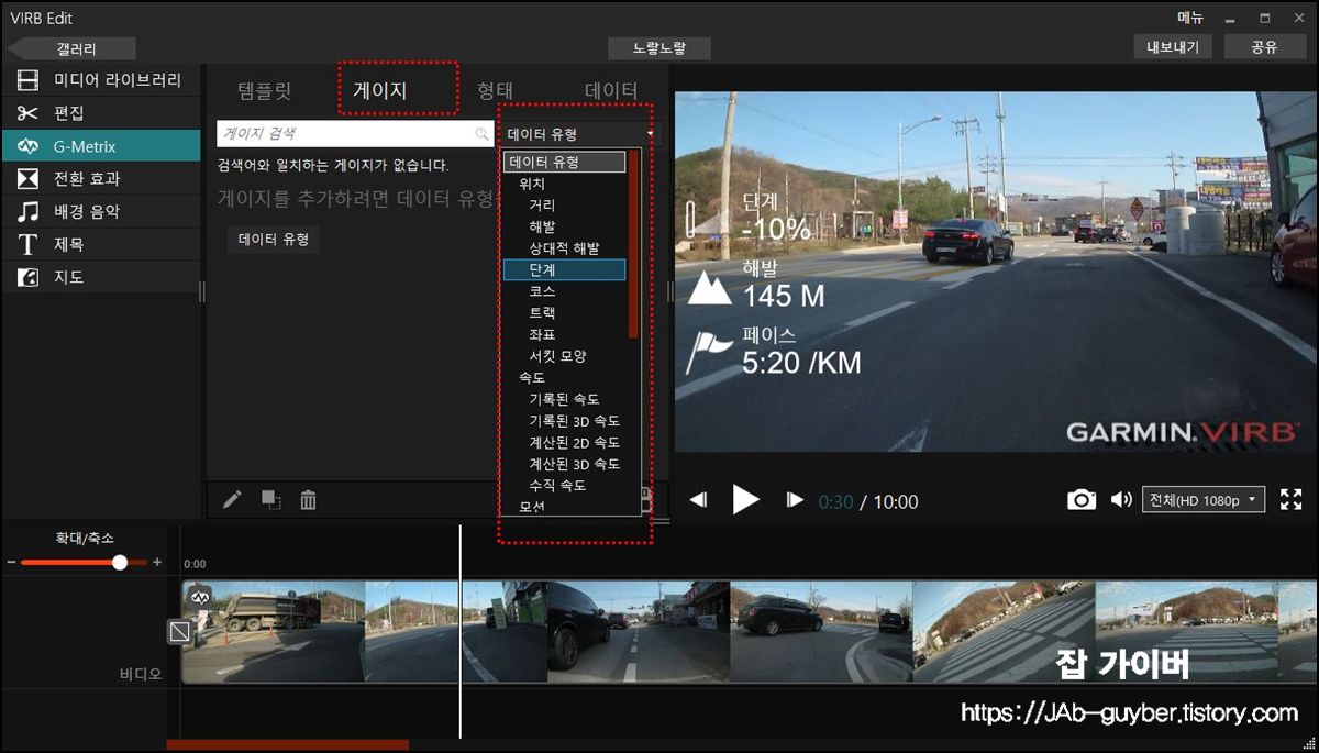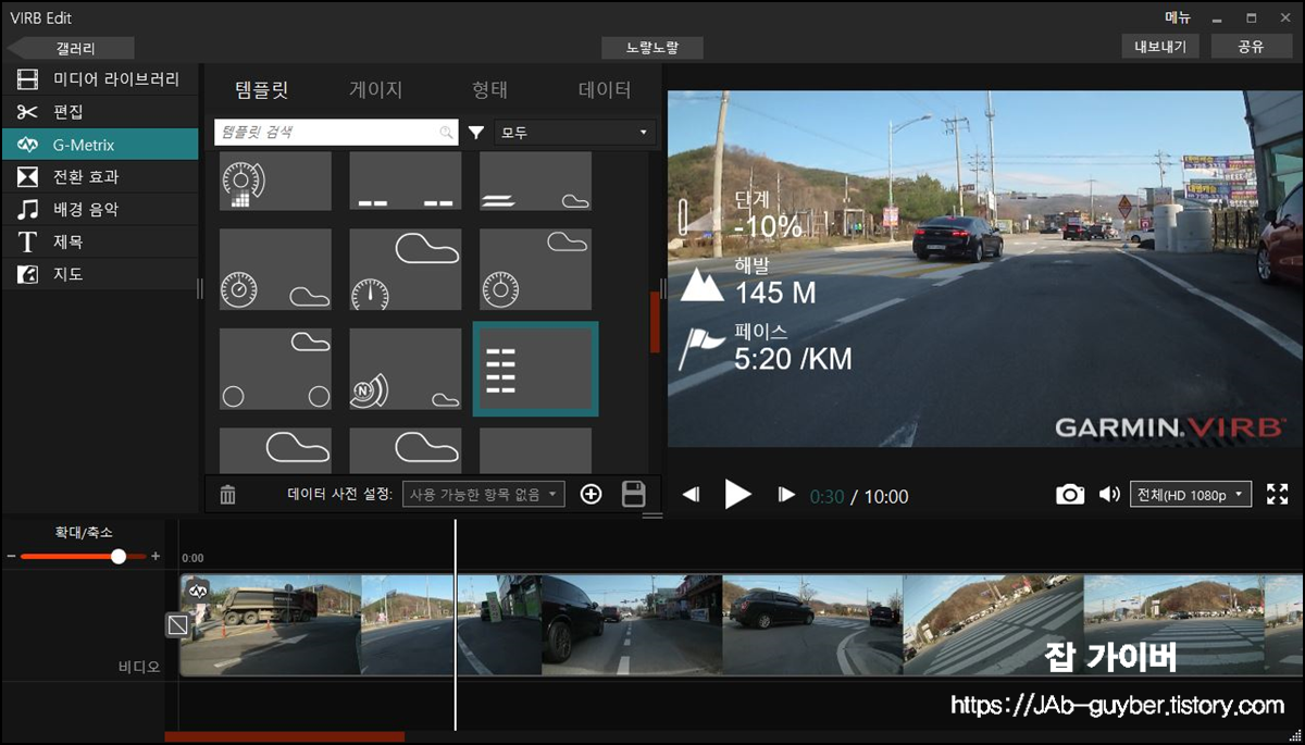 게이지에 들어가면 템플릿 외에 있는 다양한 정보를 커스터마이징 해서 영상에 삽입할 수 있습니다.