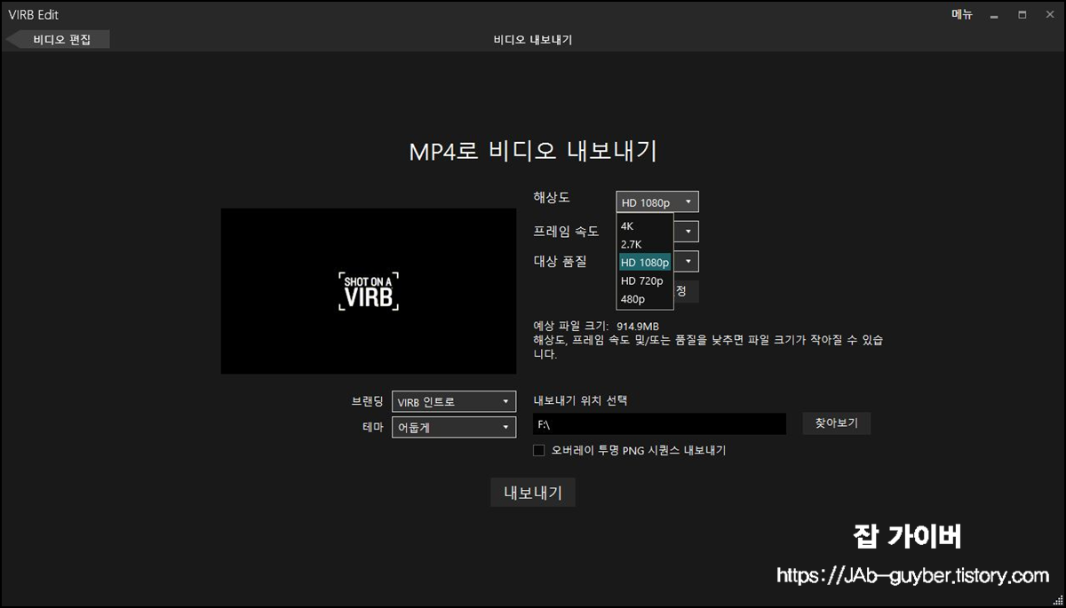 동영상은 기본적으로 MP4 파일로 내보내기 되며 저장할 위치나 해상도 프레임 품질 등을 설정합니다.
