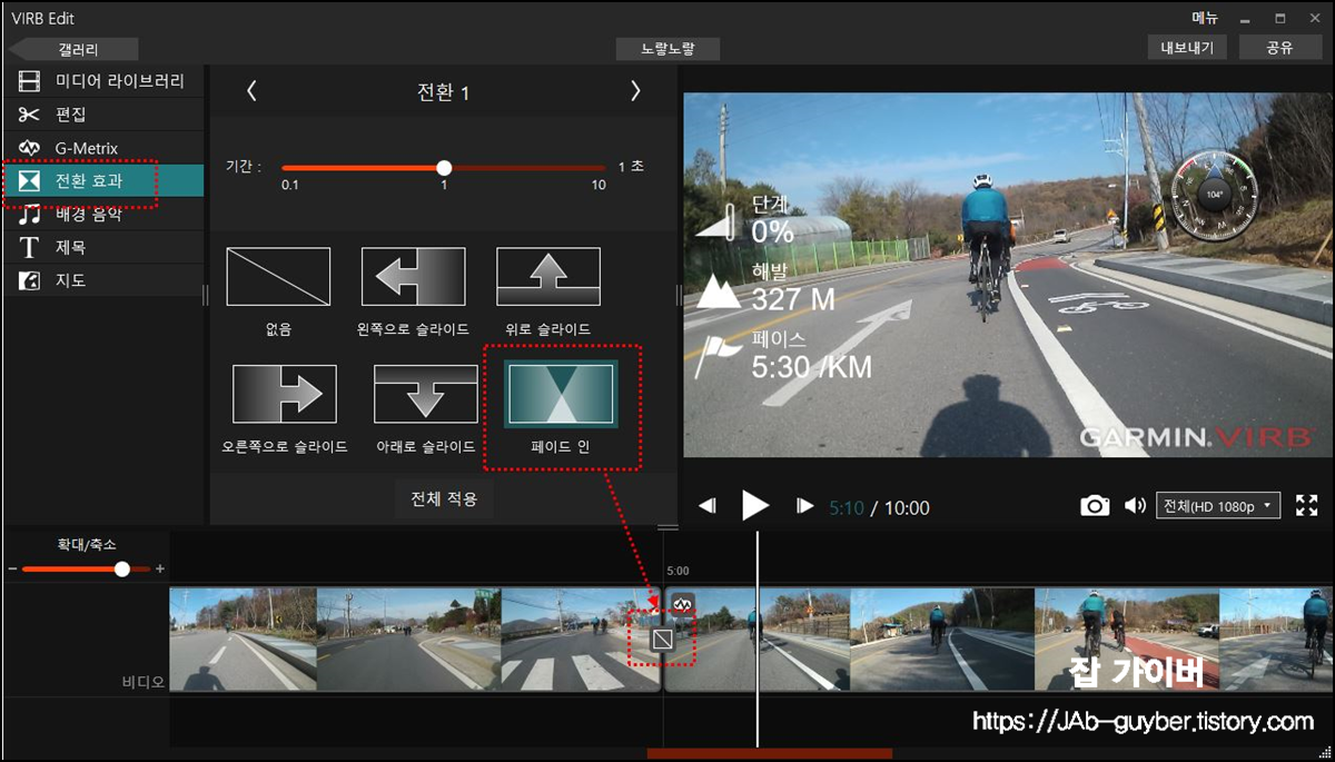 그리고 영상과 영상이 이어지는 부분에 페이드 (전환 효과)를 통해 부드럽게 설정할 수 있습니다.