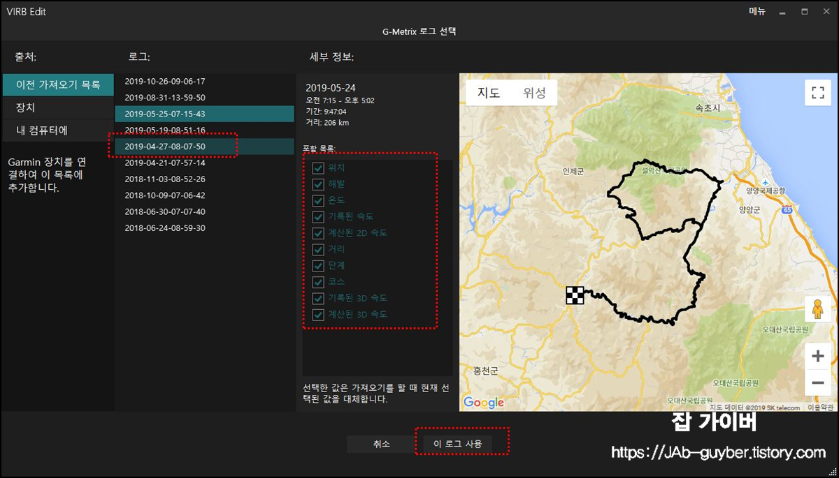 가민에 있는 로그를 불러오면 가민에 포함된 위치 및 해발, 온도, 속도, 거리등 등의 정보를 가져올 수 있습니다.
