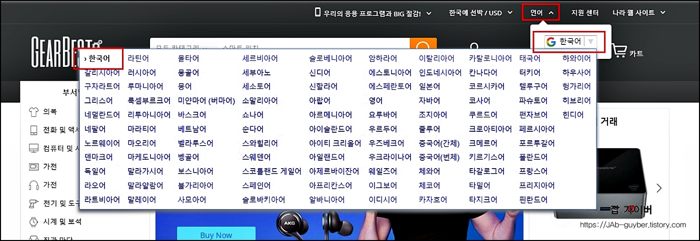 상단에 보면 언어를 영어에서 한국어로 변경하면 한글로 쇼핑도 가능합니다.