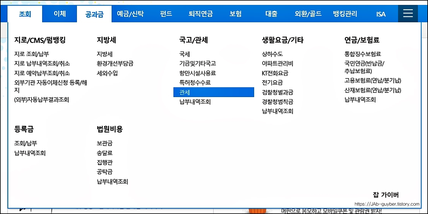은행사이트에 로그인 후 국고 / 관세 -> 관세를 선택합니다.