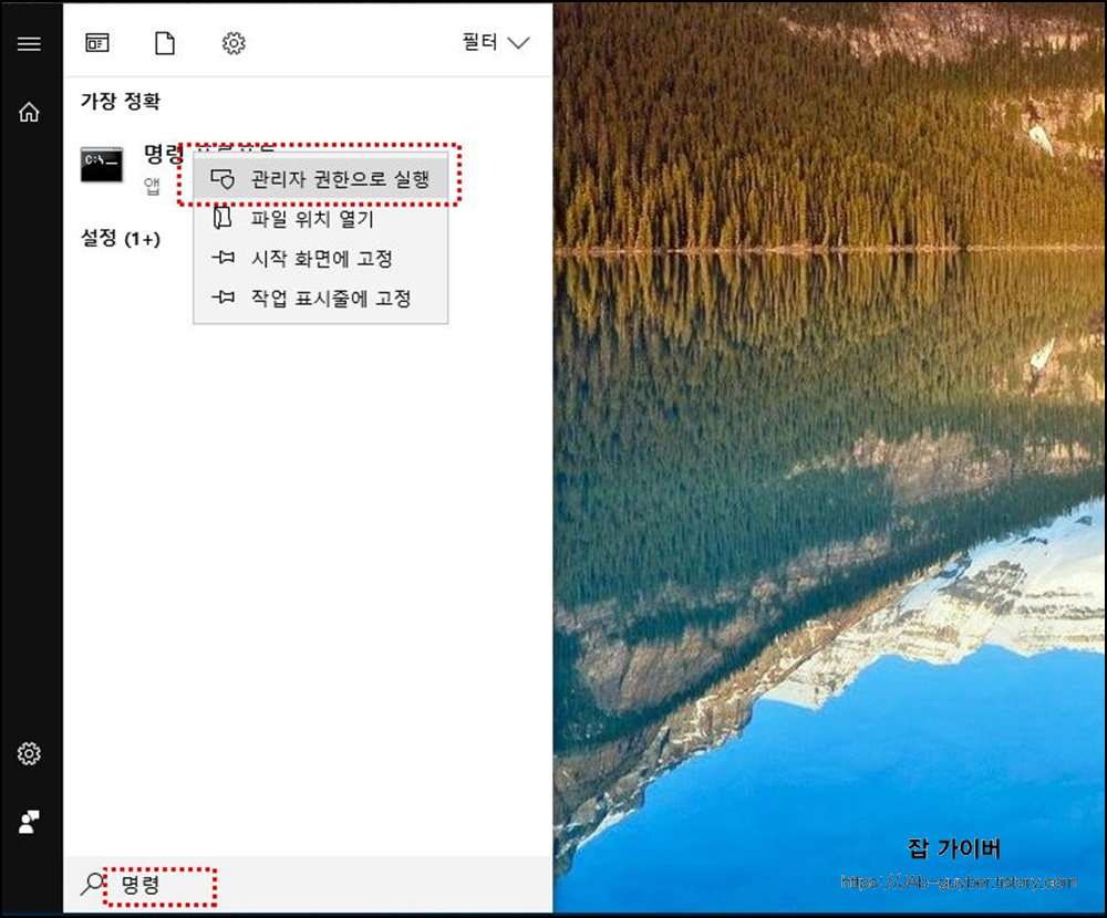 가장먼저 시작에서 명령프롬포트 or CMD를 검색해서 관리자권한으로 실행합니다.