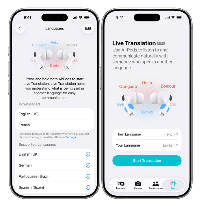 에어팟을 착용하고 상대방이 다른 언어로 말하면, 그 음성이 사용자의 선호 언어로 실시간 번역되어 들립니다. 예를 들어 일본 친구와 대화 중이라면 상대의 일본어가 곧바로 한국어로 변환되어 귀에 들리는 식입니다.