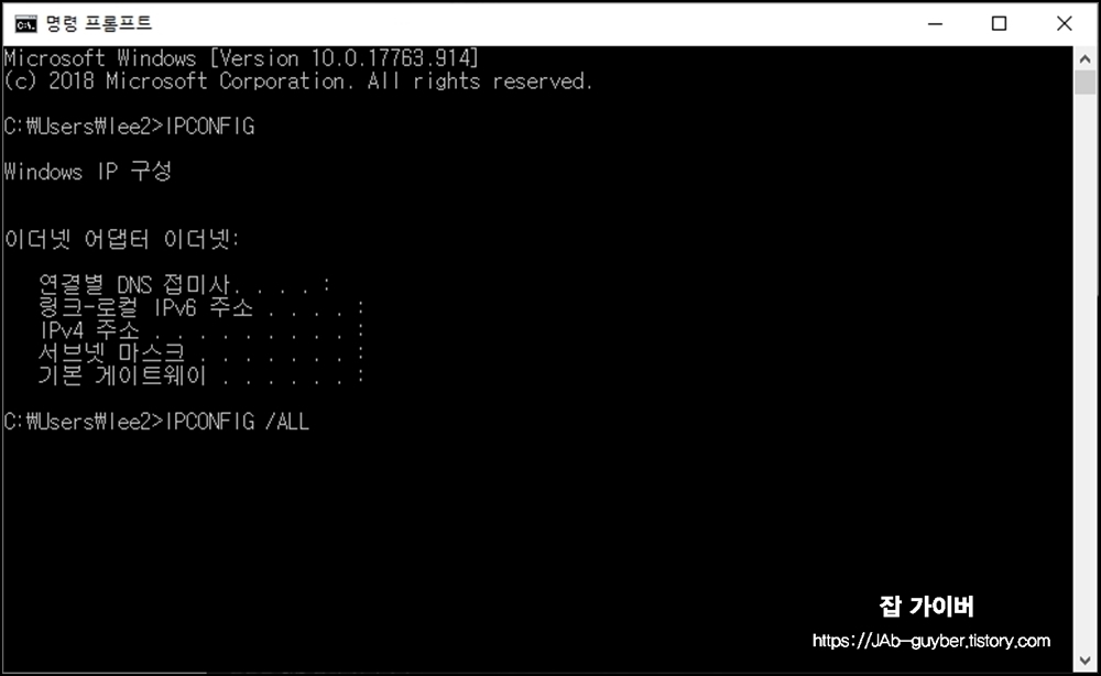 작은도스창이 뜬다면 IPCONFIG 라고 입력 후 엔터를 누릅니다.