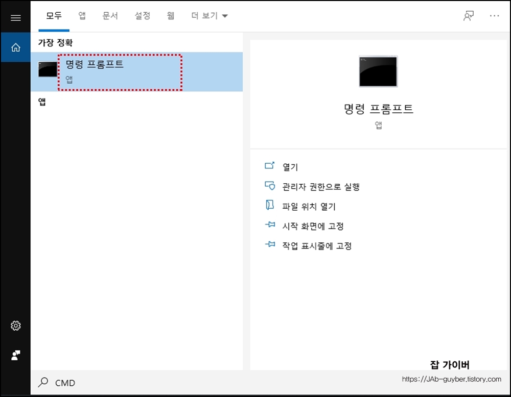시작에서 CMD or 명령프롬프트 실행합니다.
