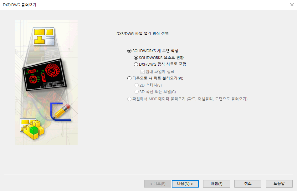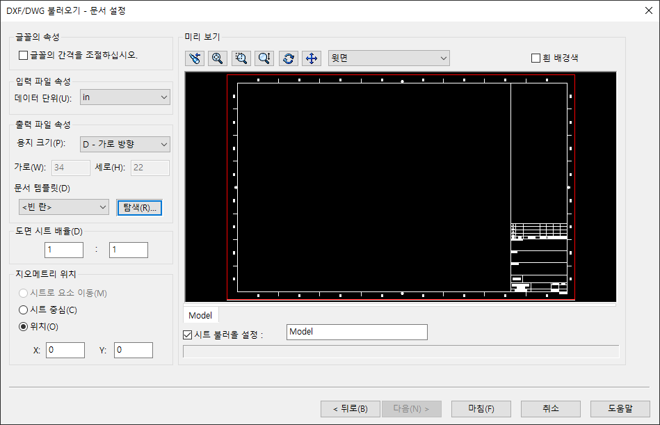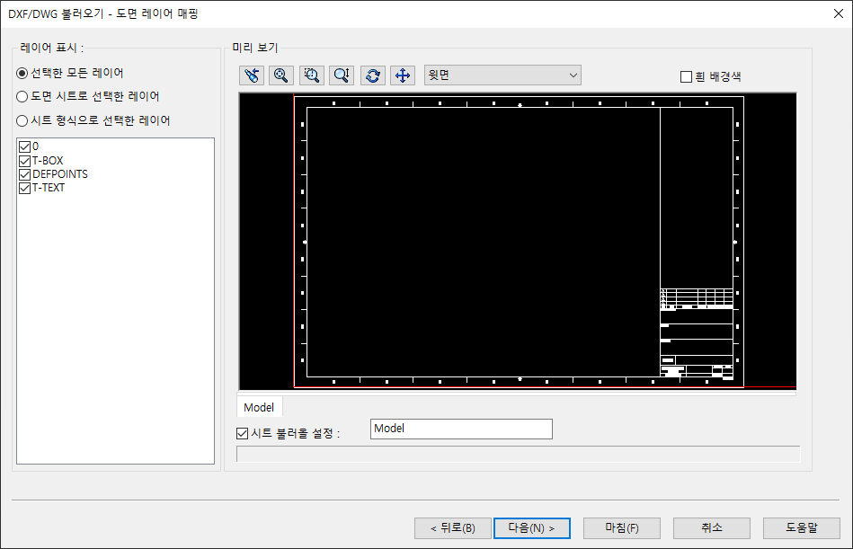 DWG 파일을 선택하면 변환 마법사가 뜨는데,