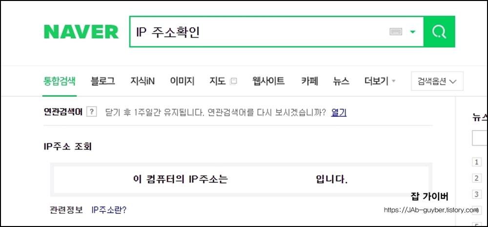 가장 간단한 방법으로는 네이버 검색엔진에 IP주소 검색하면 쉽게 컴퓨터의 IP주소를 확인할 수 있습니다.