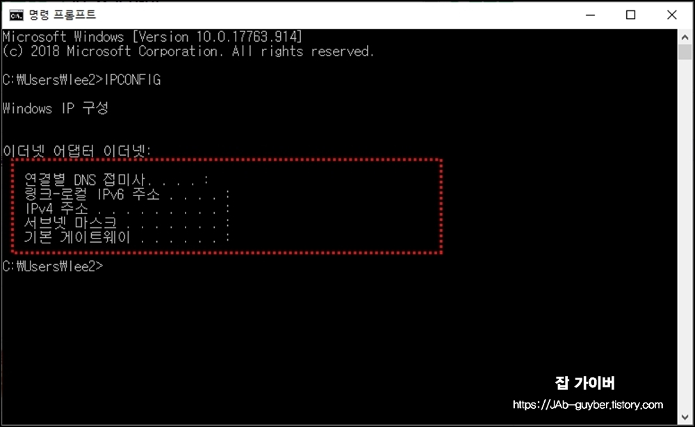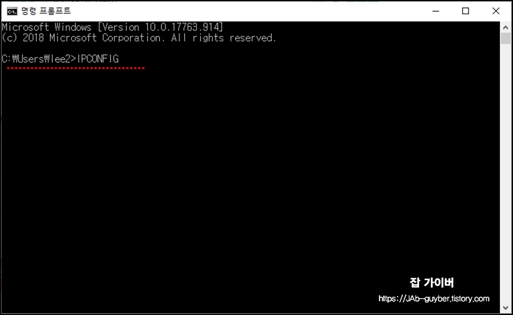 작은도스창이 뜬다면 IPCONFIG 라고 입력 후 엔터를 누릅니다.