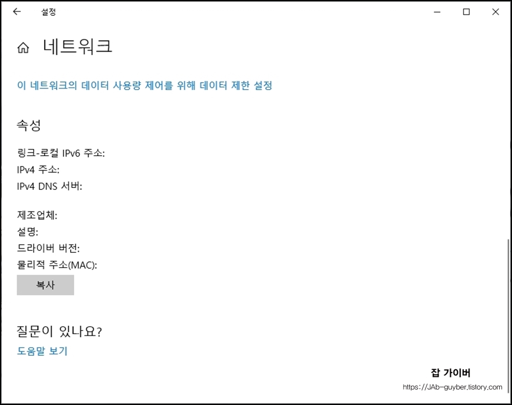 네트워크창이 실행되며 하단으로 쭉 내리면 IPCONFIG 에서 확인한 IP주소를 확인할 수 있습니다.