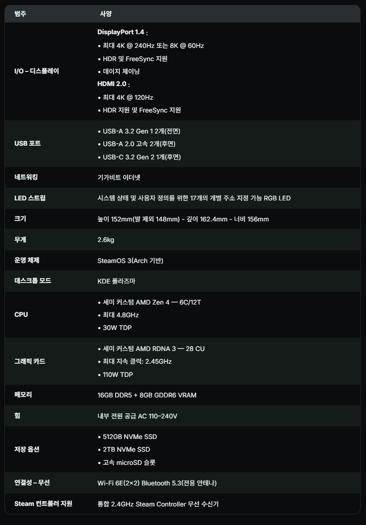 | Steam Machine | AMD RDNA 3 기반 커스텀 APU | RX 7600보다 소폭 축소 추정 | 8GB 통합 메모리 | 1080p~1440p + FSR 업스케일 4K |