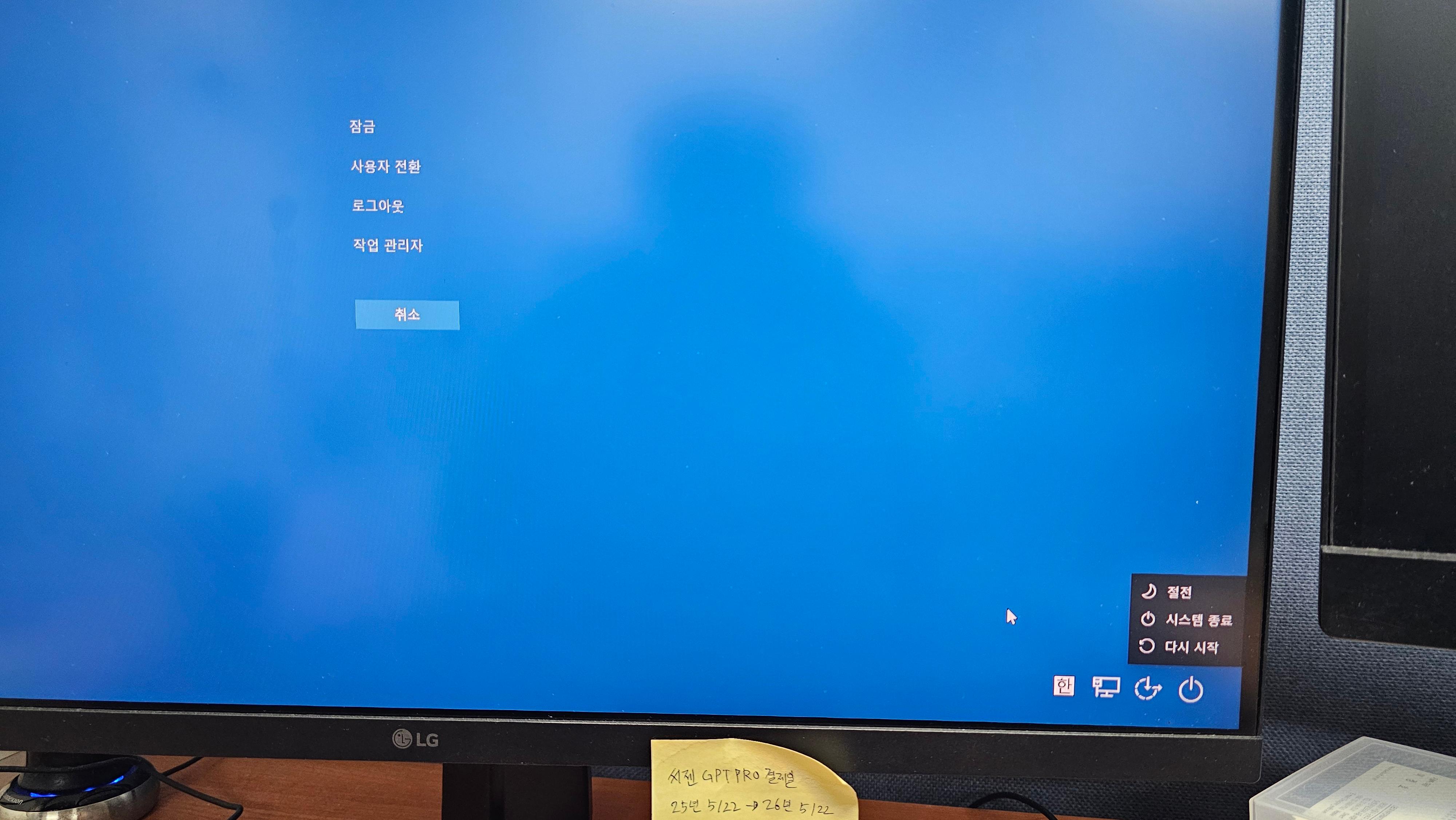 화면이 전환되면서 ‘잠금’, ’사용자 전환’, ’로그아웃’, ’작업 관리자’ 등이 나타납니다.