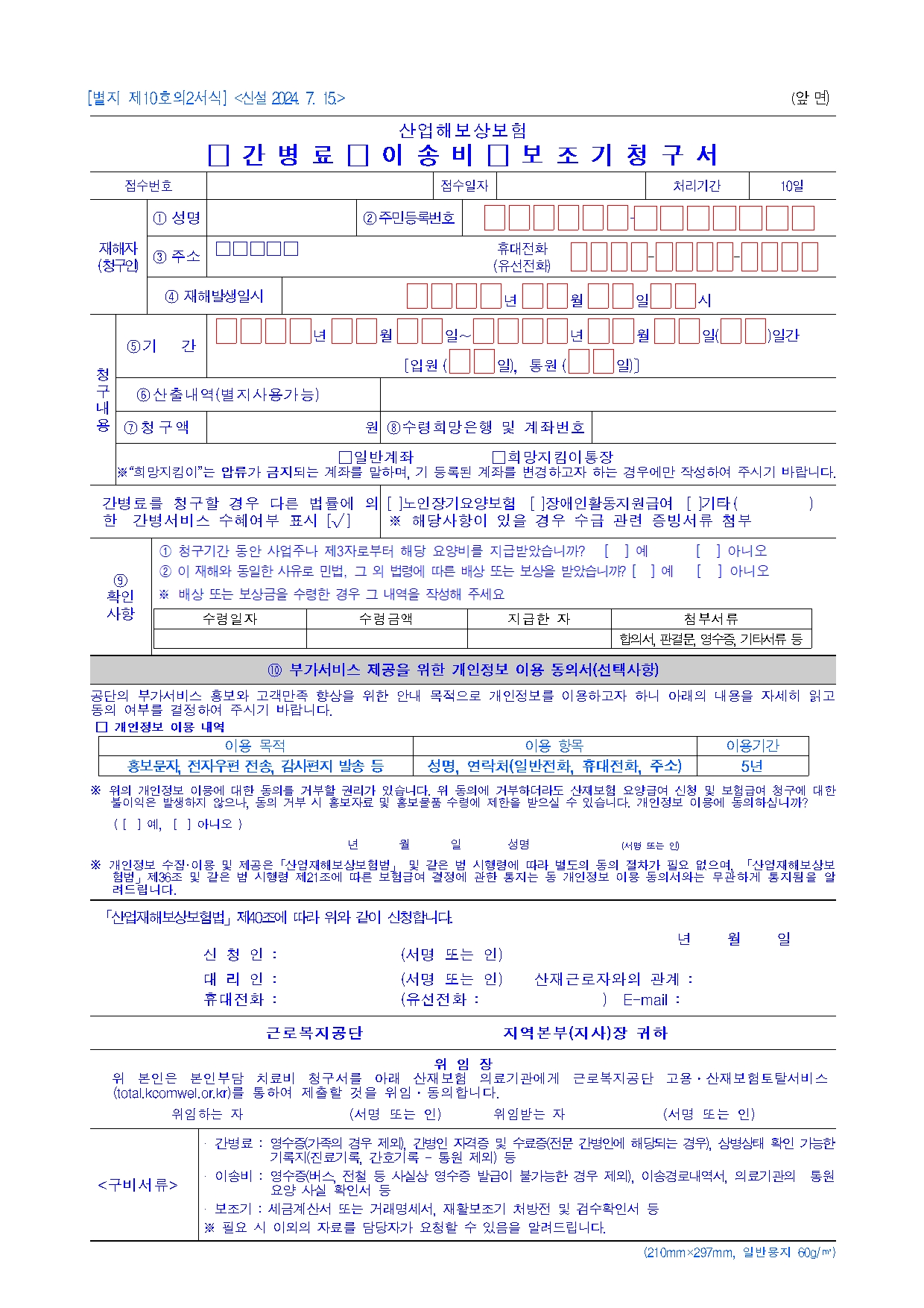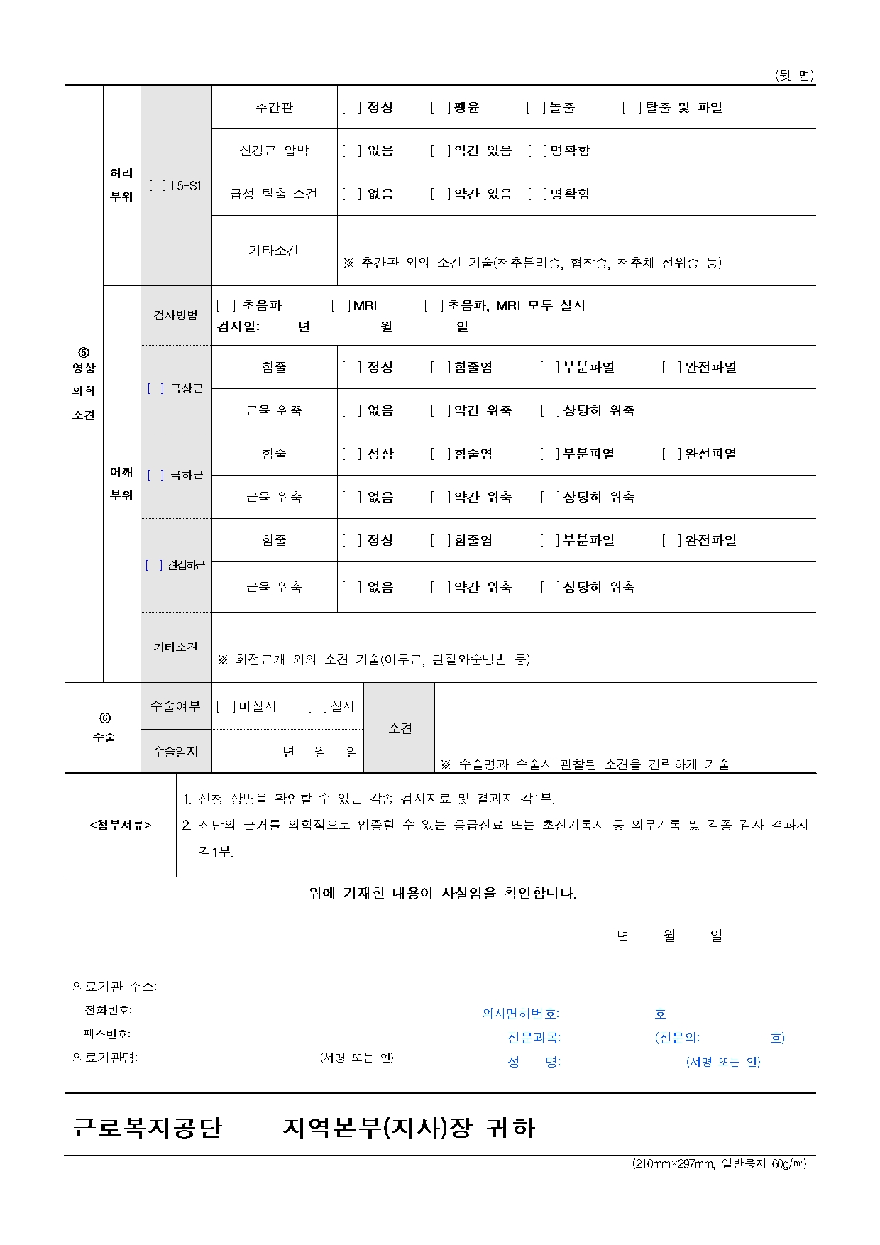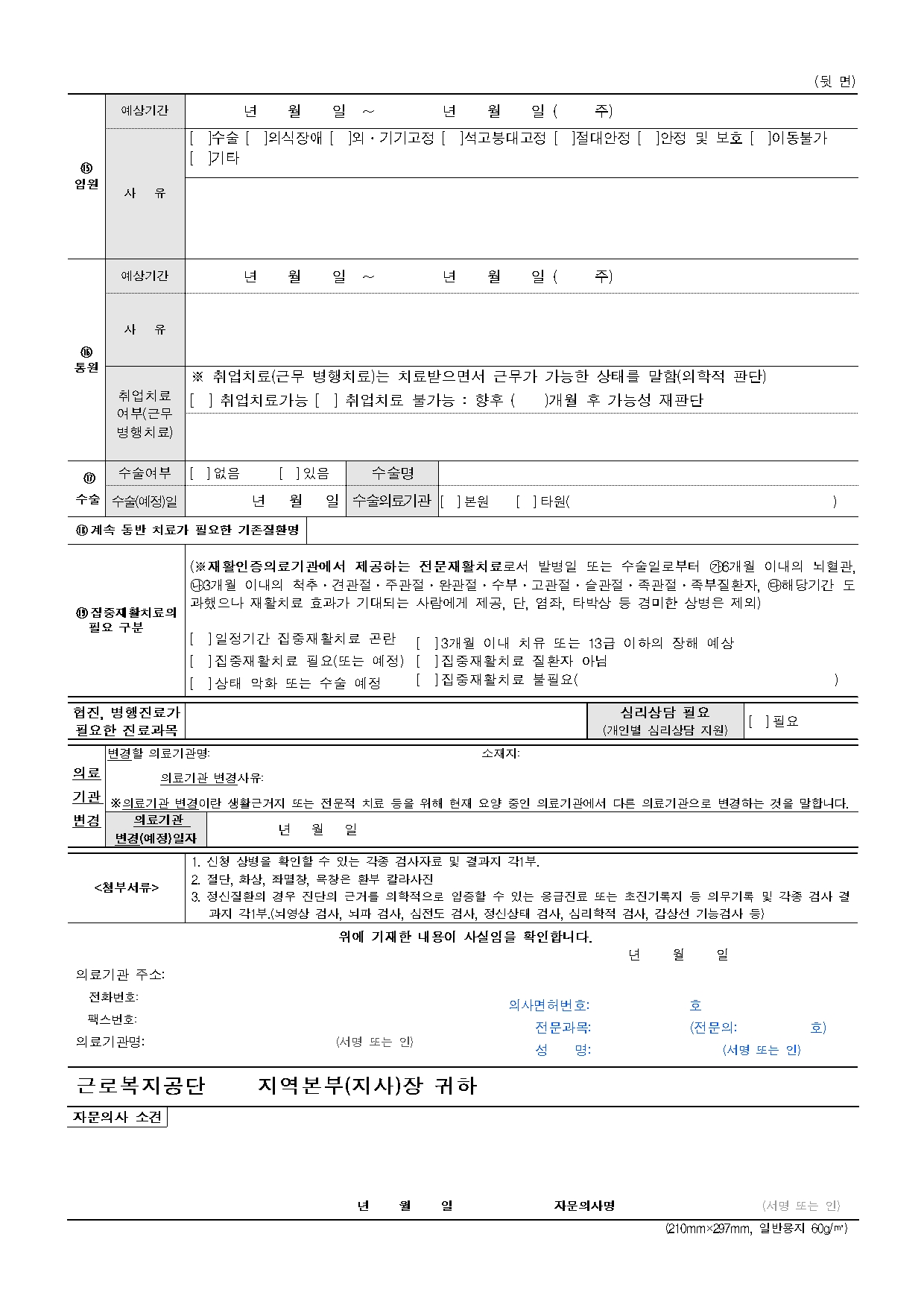 현실적으로는 주치의 소견서가 가장 중요합니다. 주치의가 “해당 비급여 치료가 업무상 재해로 인한 상병 치료에 필수적”이라는 의견을 내고, 진료비 세부내역서·영수증·수술기록지·경과기록지 등을 함께 붙여서 공단에 청구하면, 공단이 심의 후 지원 여부를 결정하게 됩니다.