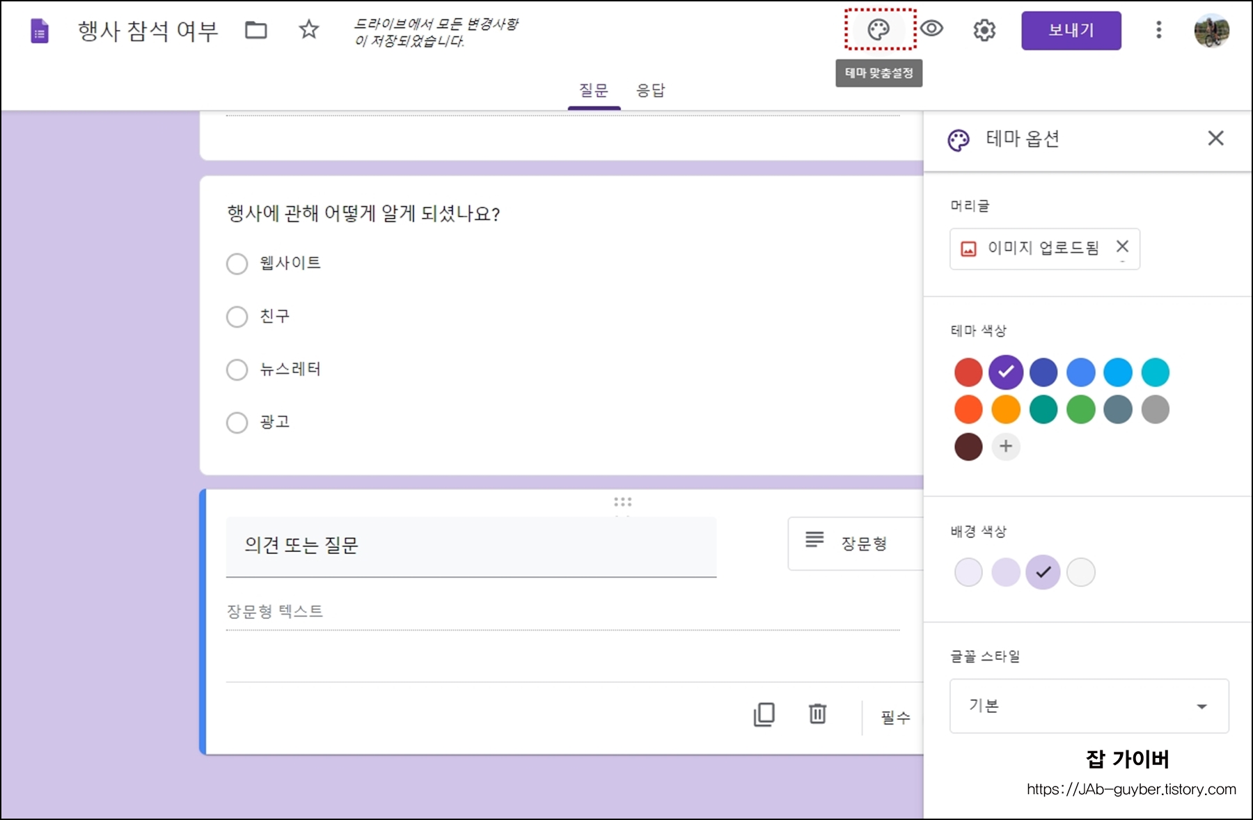 테마 옵션을 선택하면 설문지의 디자인 색상등을 자유롭게 변경도 가능합니다.