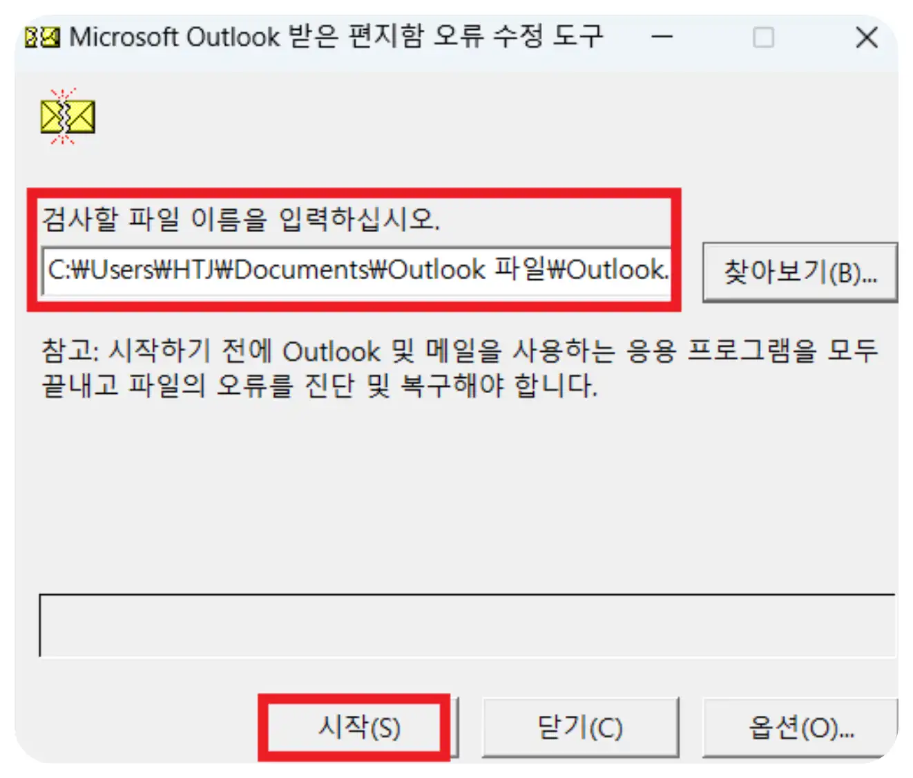 ScanPst.exe를 찾았으면, 아이콘을 더블 클릭해 실행합니다. 창이 열리면 상단에 “찾아보기” 버튼이 보이는데, 여기서 앞서 메모해 두었던 문제가 발생한 PST 파일의 경로를 지정합니다.