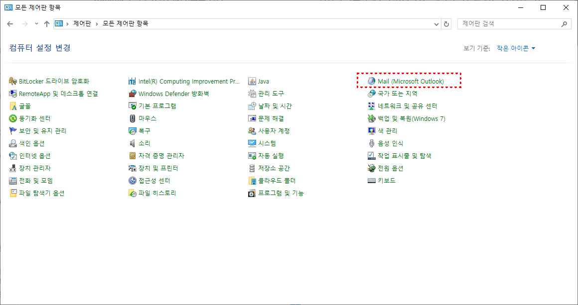 Windows 검색창에서 제어판을 입력해 실행한 뒤, 보기 기준을 작은 아이콘으로 바꾸고 Mail(메일) 항목을 찾아 들어갑니다. 또는 Win + R 키를 누르고 control을 입력한 뒤, 나타나는 제어판에서 Mail을 여는 방법도 있습니다.