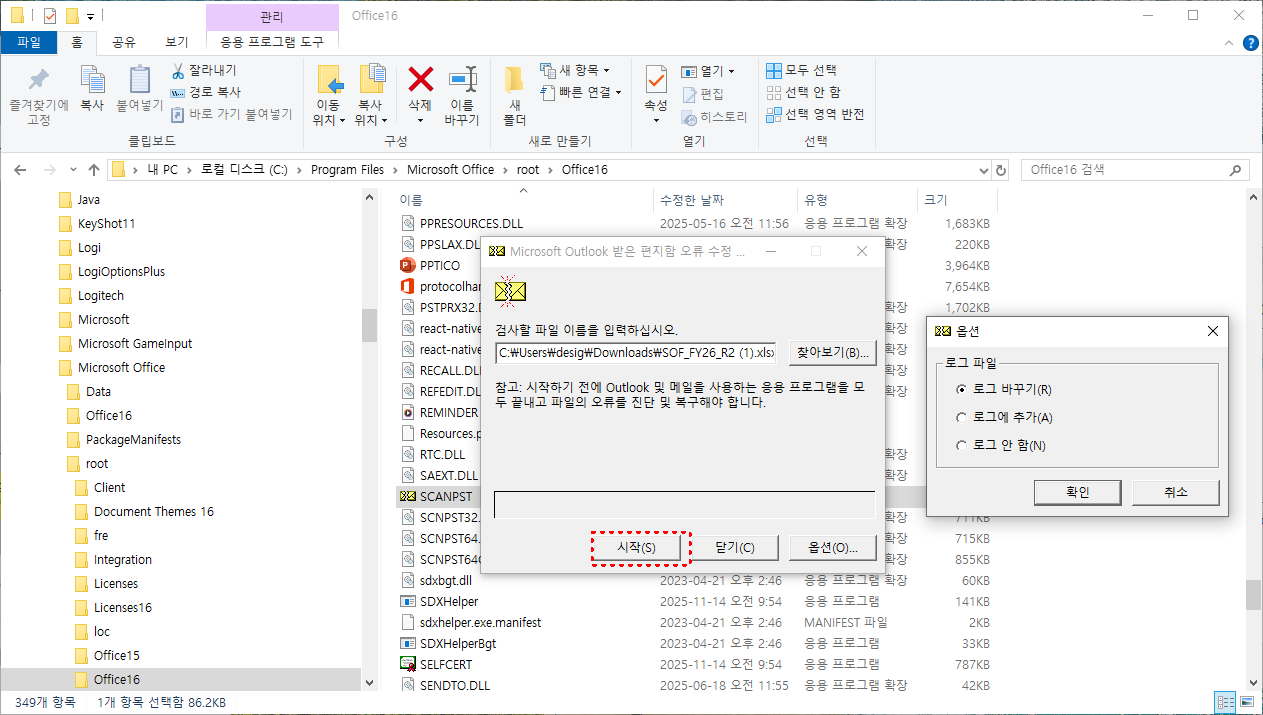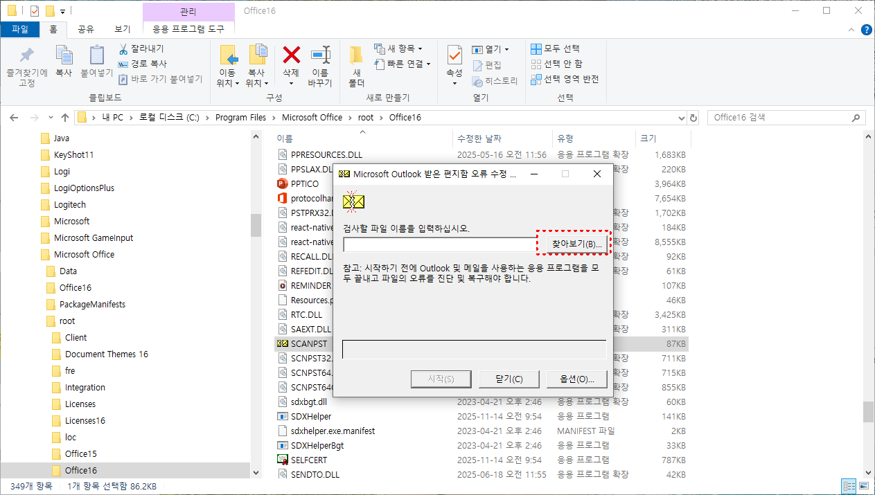 ScanPST의 위치는 설치된 Outlook 버전과 비트 수에 따라 조금씩 다르지만, 일반적으로는 Office 설치 폴더 안에서 찾을 수 있습니다. 글을 쓰면서 사용했던 환경에서는 다음 경로에서 확인할 수 있었습니다.