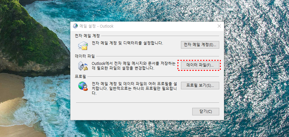 Mail 설정 창이 열리면 데이터 파일 버튼을 선택합니다.