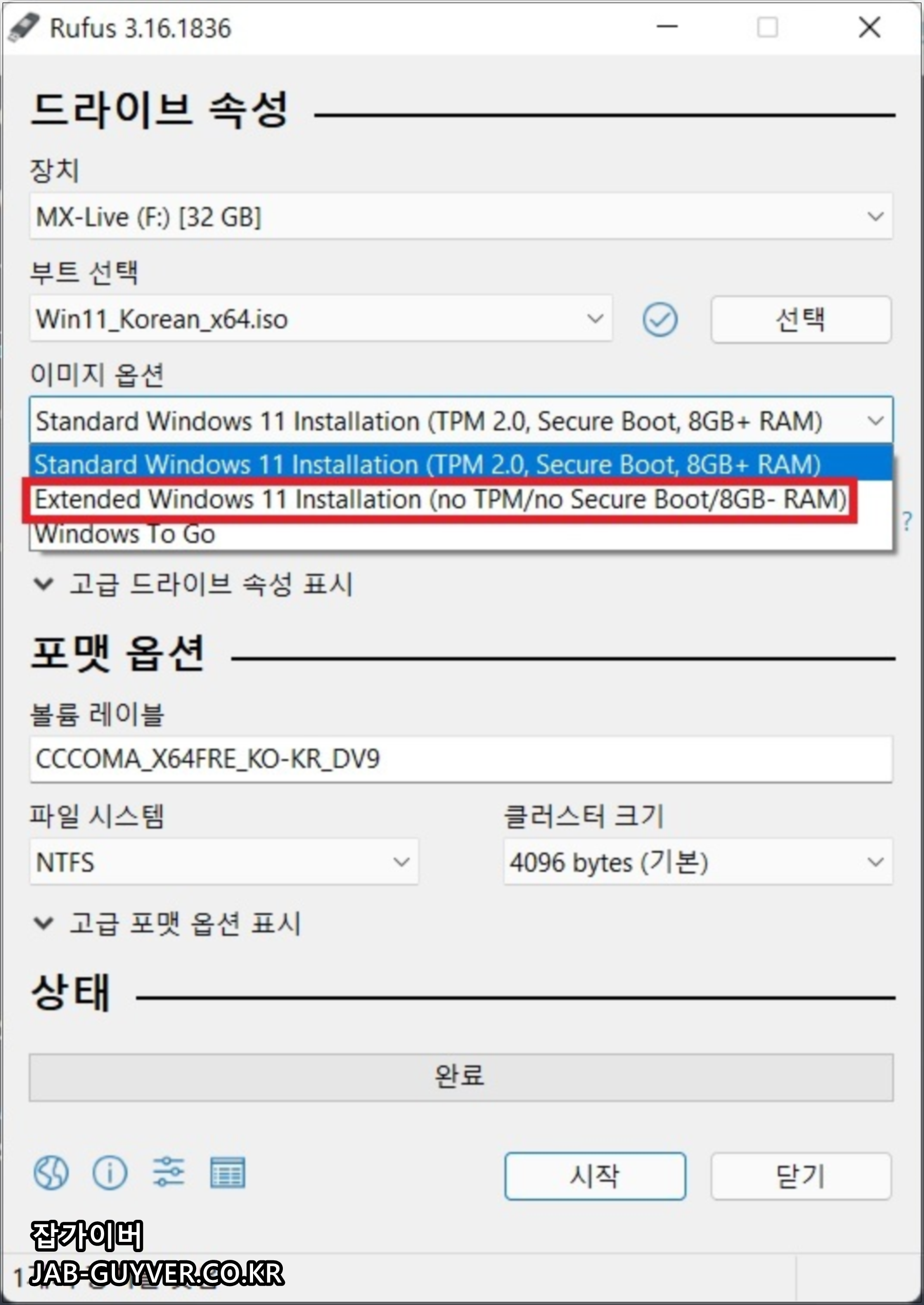 윈도우11 ISO와 8GB 이상 USB를 준비한 뒤 Rufus에서 이미지를 선택하고, 이미지 옵션에서 확장 설치(Extended) – no TPM / no Secure Boot 항목을 선택하면, TPM·보안부팅·RAM 체크를 상당 부분 자동으로 제거한 설치 USB가 만들어집니다.