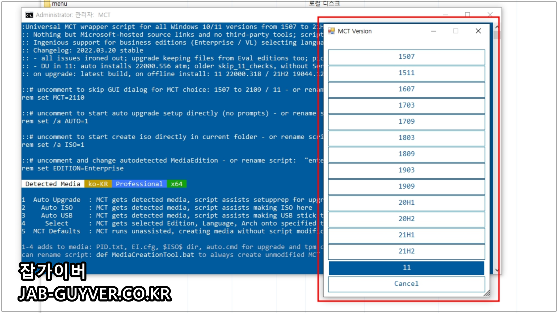 압축을 풀고 MediaCreationTool.bat 파일을 관리자 권한으로 실행하면 화면처럼 설치 버전 선택 창이 뜹니다.