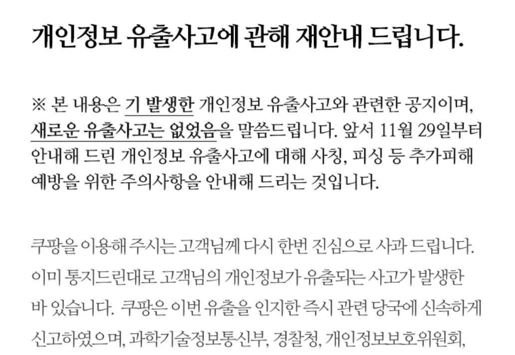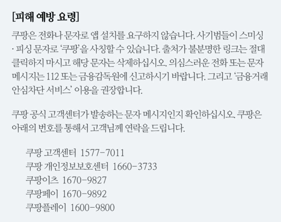 | 로그인 이력 | 마이쿠팡의 보안·로그인 메뉴에서 낯선 기기·위치 확인 후 전체 로그아웃 | 계정 도용 가능성 차단 및 2차 피해 방지 |