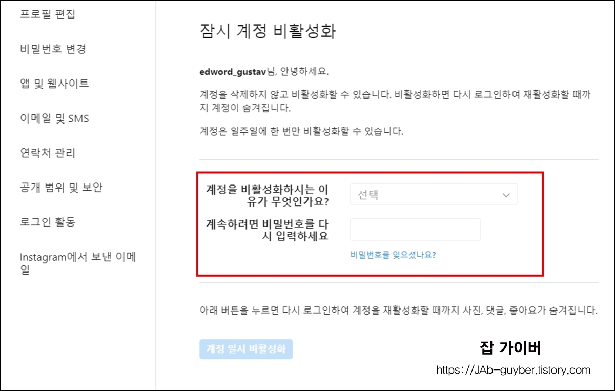 인스타그램 계정 잠시 비활성화 하는 법, 사유 선택, 복구까지 한 번에 정리