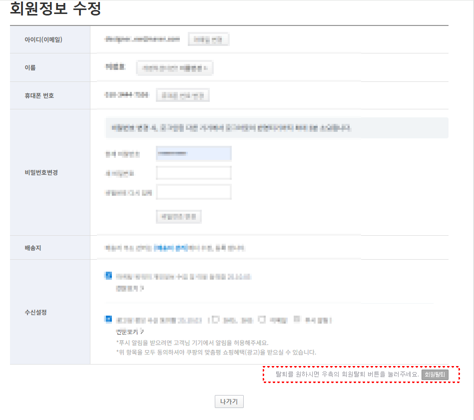 이곳의 하단에서 회원 탈퇴 버튼을 찾을 수 있다. 클릭하면 본인 인증과 이용 내역 확인을 거쳐 탈퇴가 진행된다. 화면 구성은 비교적 단순하지만 탈퇴 버튼이 깊이 숨어 있어 초보자는 한 번쯤 찾기 어려워하는 경우가 많다.