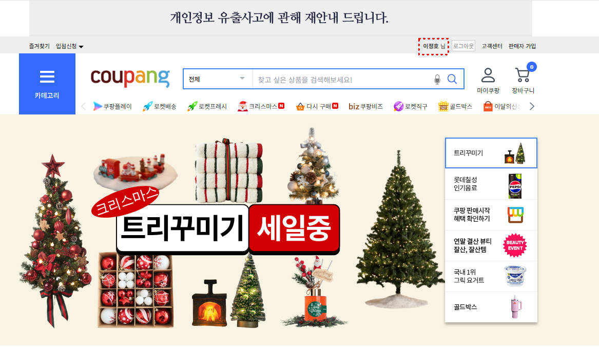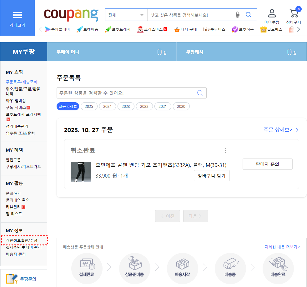 PC에서는 로그인 후 상단 메뉴의 마이쿠팡을 선택하면 왼쪽에 개인정보 확인/수정 메뉴가 보인다.