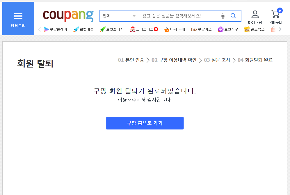 | 쿠팡캐시 잔액 | 포인트 형태라 환불이 안 되므로 탈퇴 전 모두 사용하는 것이 좋다. |