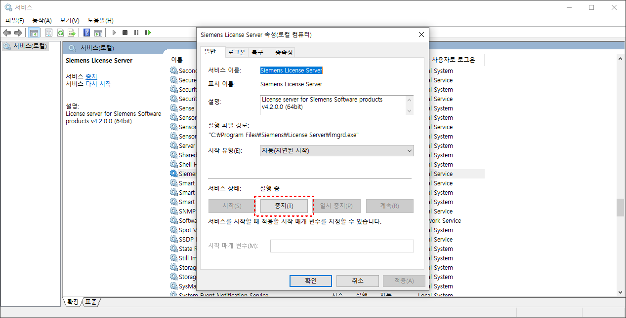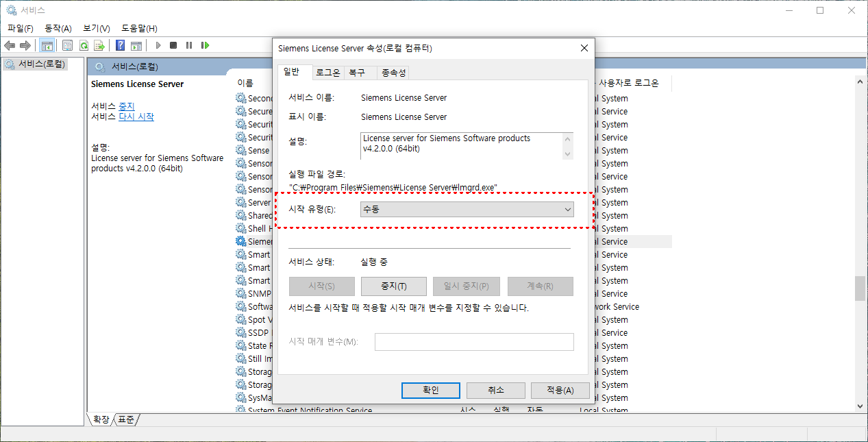 서비스 관리 화면(services.msc)을 열면 Siemens PLM License Server 또는 FlexNet Licensing Service라는 이름이 눈에 띄는데, 이 항목의 시작 유형을 수동(Manual) 또는 사용 안 함(Disabled)으로 바꾸면 된다. 현재 켜져 있다면 ‘중지’까지 눌러 완전히 내려주는 것이 좋다.