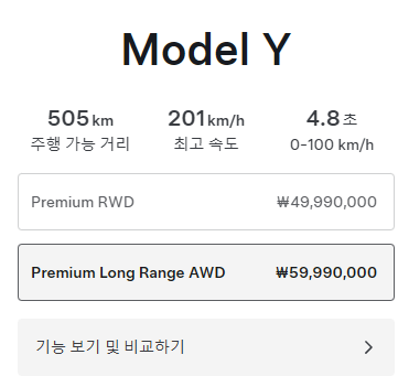 | Model Y Long Range AWD | 듀얼 모터 SUV, 고속 안정감·주행거리 강화 | ₩59,990,000 |