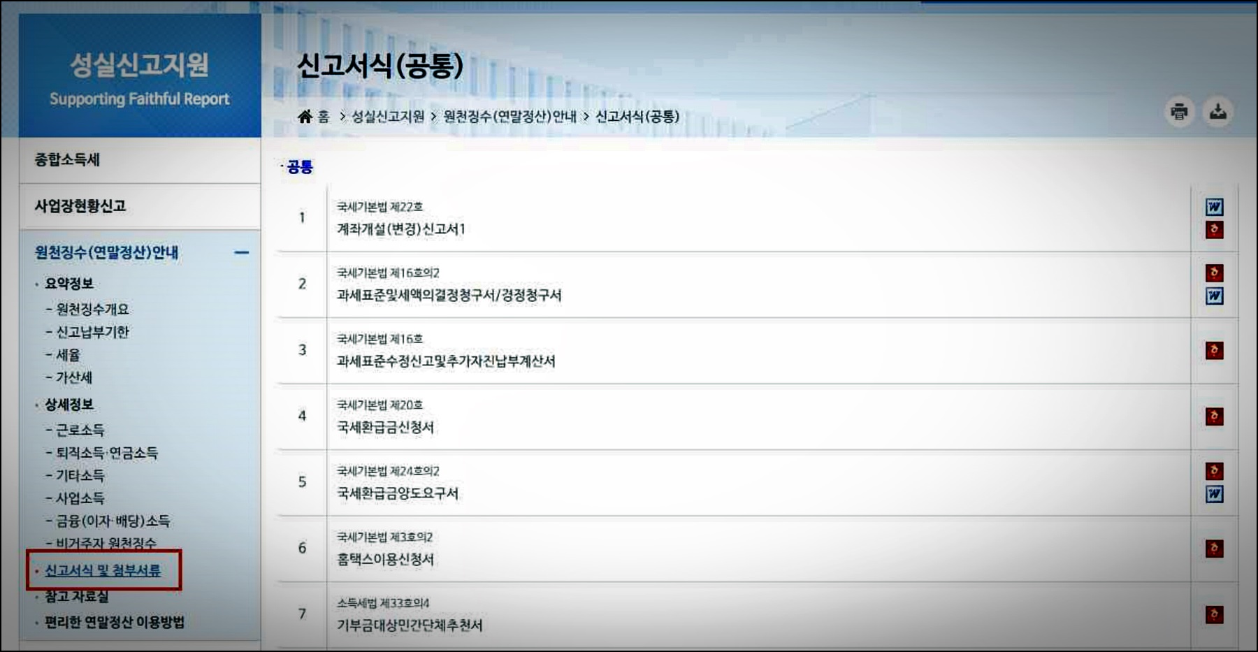 - 성실신고지원 -> 원천징수(연말정산)안내 선택합니다.