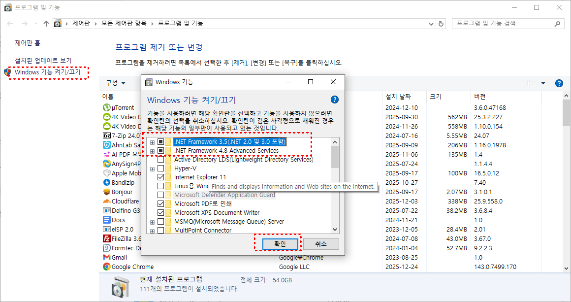 윈도우11은 설정 → 앱 → 선택적 기능 → 기타 Windows 기능, 윈도우10은 프로그램 및 기능 → Windows 기능 켜기/끄기에서 .NET 항목이 켜져 있는지 확인합니다.