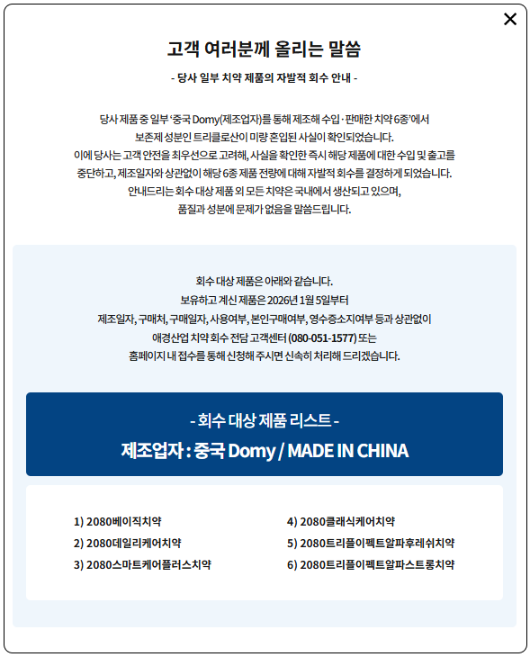 이번 이슈는 2080 전체가 아니라, 중국 제조(제조업자 Domy 표기)로 유통된 일부 2080 치약 6종이 핵심입니다.