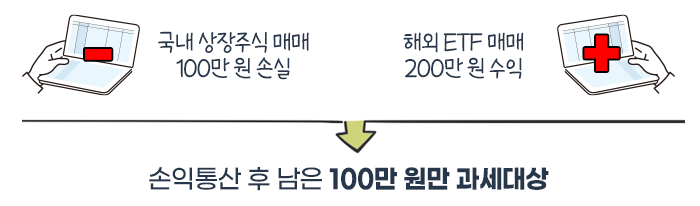 국내 상장주식 매매로 -100만원, 해외 ETF 등에서 +200만원의 결과가 나왔다면, 손익을 합친 뒤 +100만원만 과세 기준으로 보게 되는 방식으로 이해하면 감이 빠릅니다.