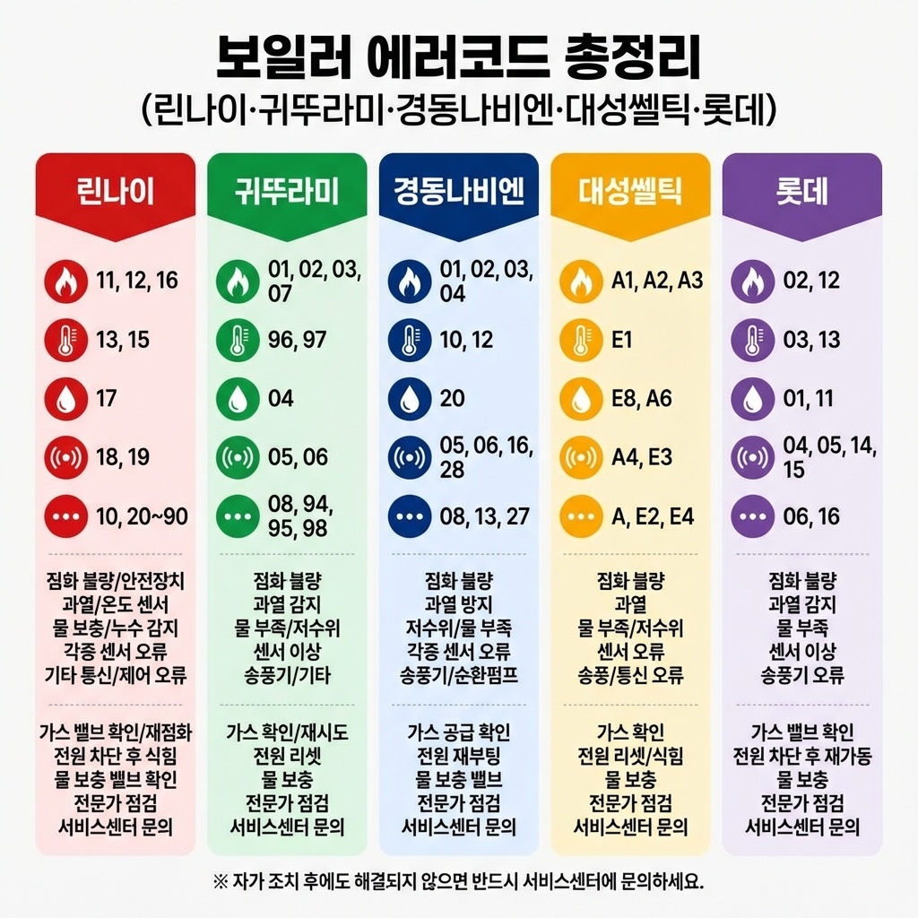 보일러 에러코드 총정리 (린나이·귀뚜라미·경동나비엔·대성쎌틱·롯데)