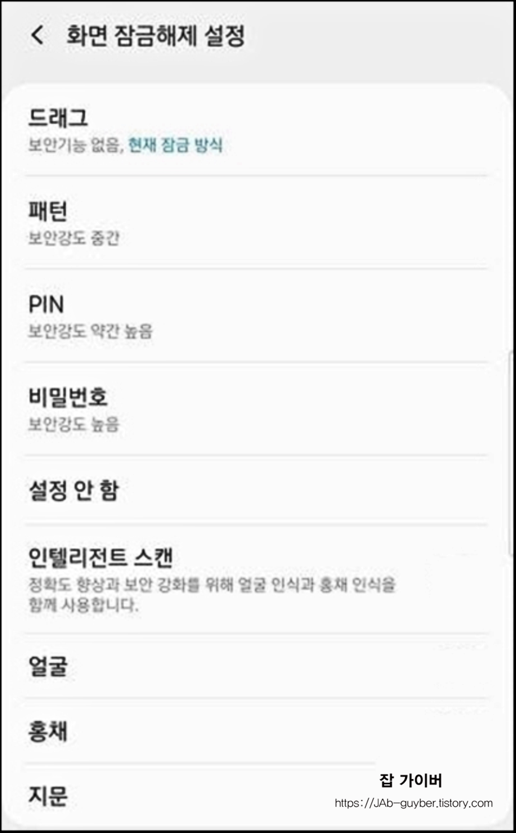 하단의 잠금해제 버튼을 선택하면 패턴 및 PIN,비밀번호,얼굴,홍체,지문등 모든 보안시스템이 초기화 된것을 볼 수 있습니다.