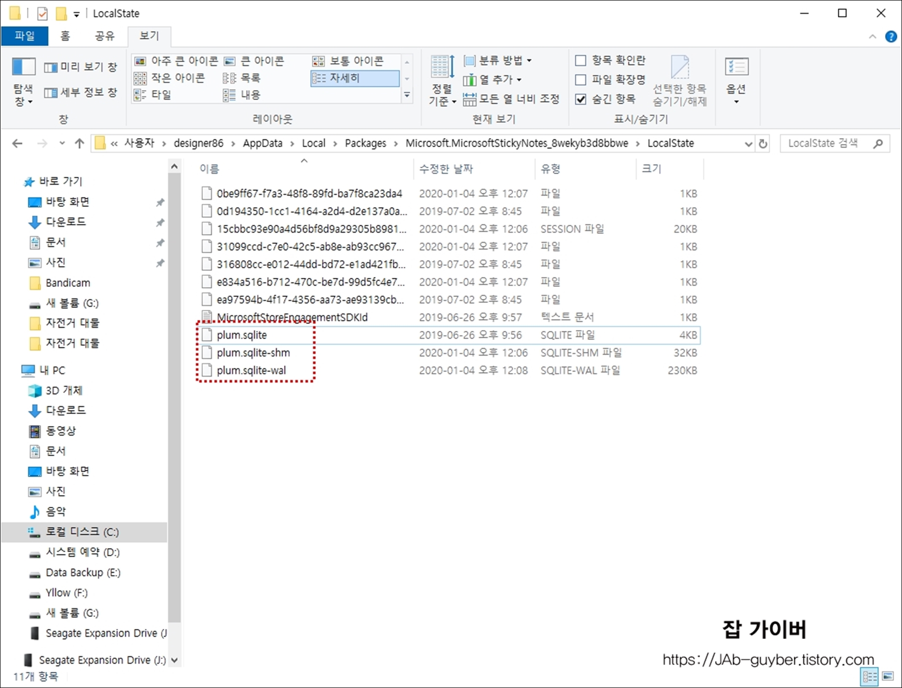 해당 폴더에서 plum.sqlite 파일을 찾습니다. 이 파일이 스티커메모의 데이터 백업 파일입니다.