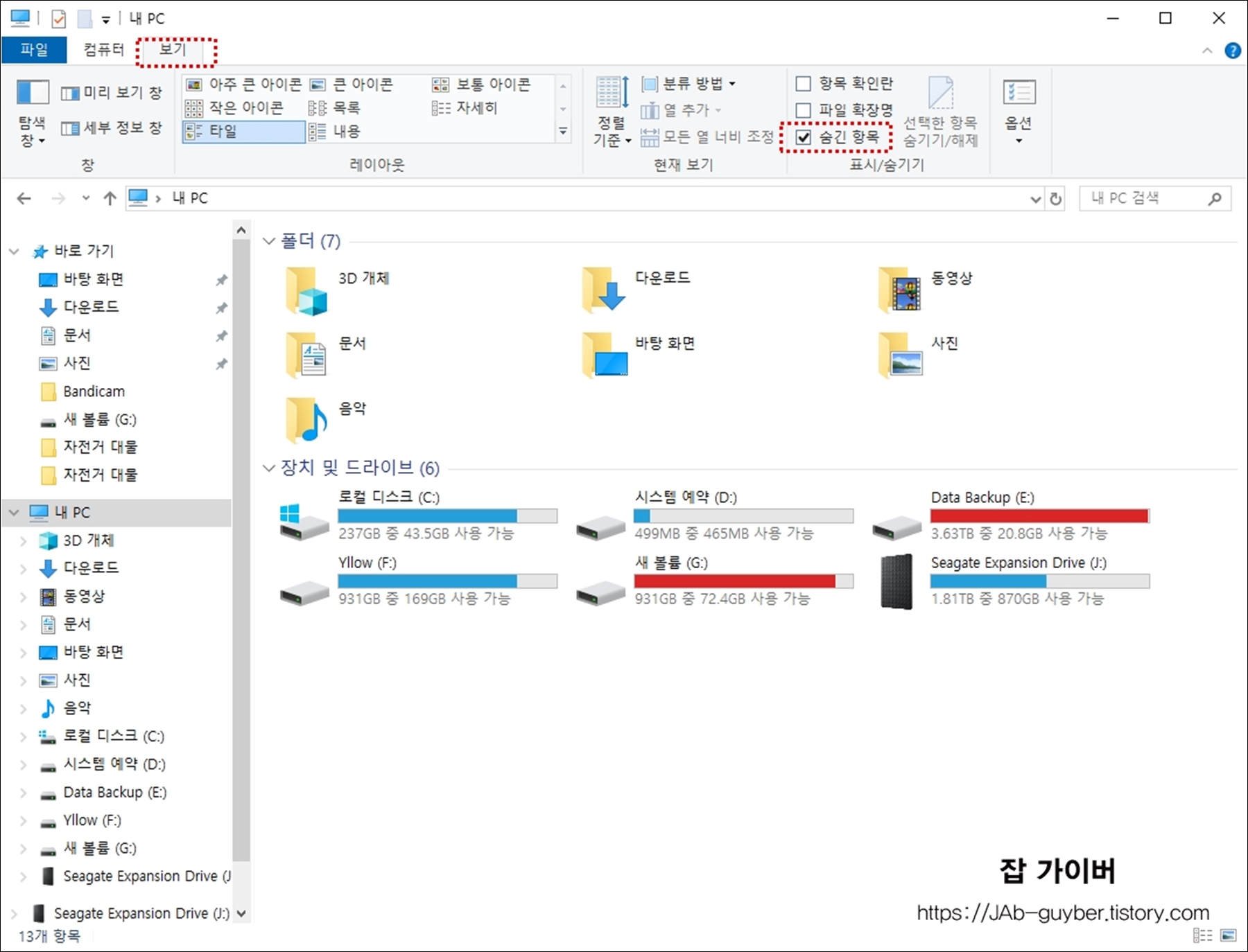 내컴퓨터를 실행 후 보기 -> 숨긴항목 표시를 위해 체크를 해줍니다.