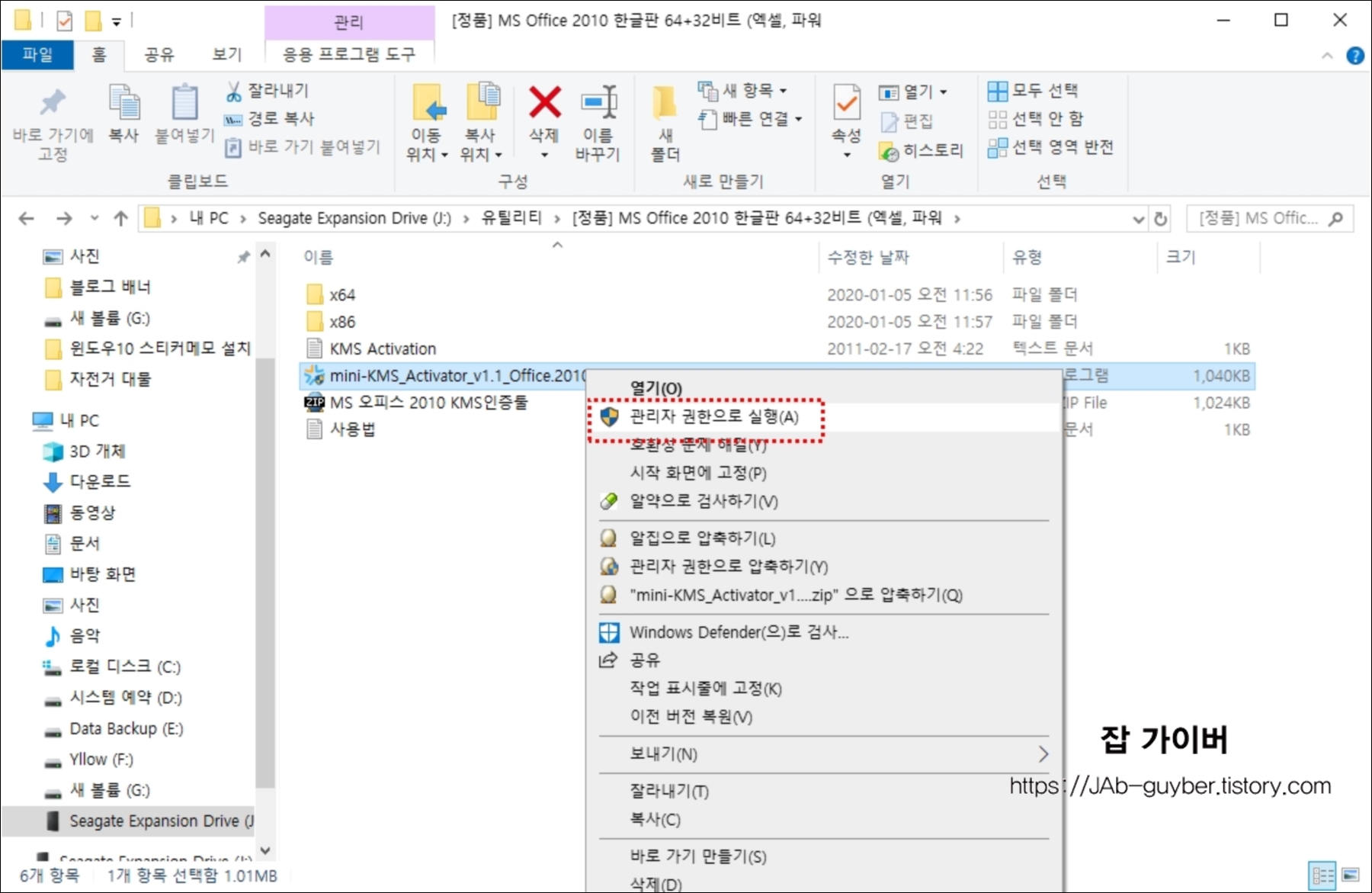 설치경로에 보면 mini-KMS_Activator_v1.1_office2010 관리자권한으로 실행합니다.