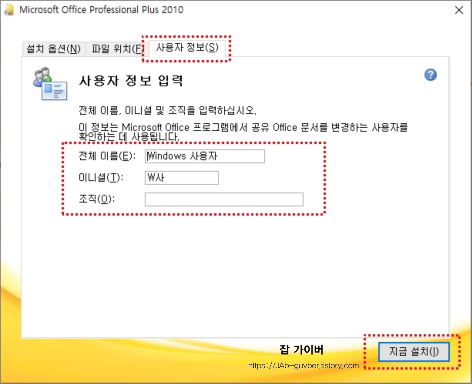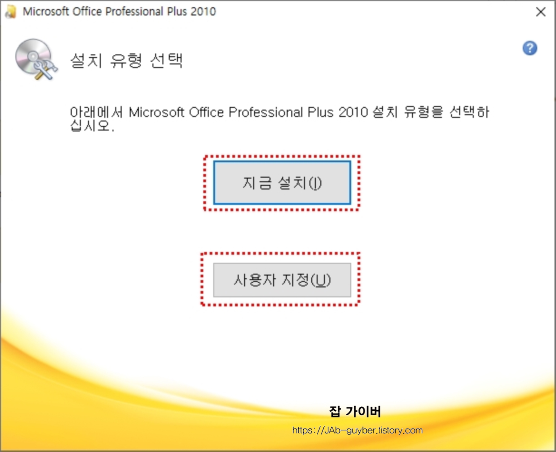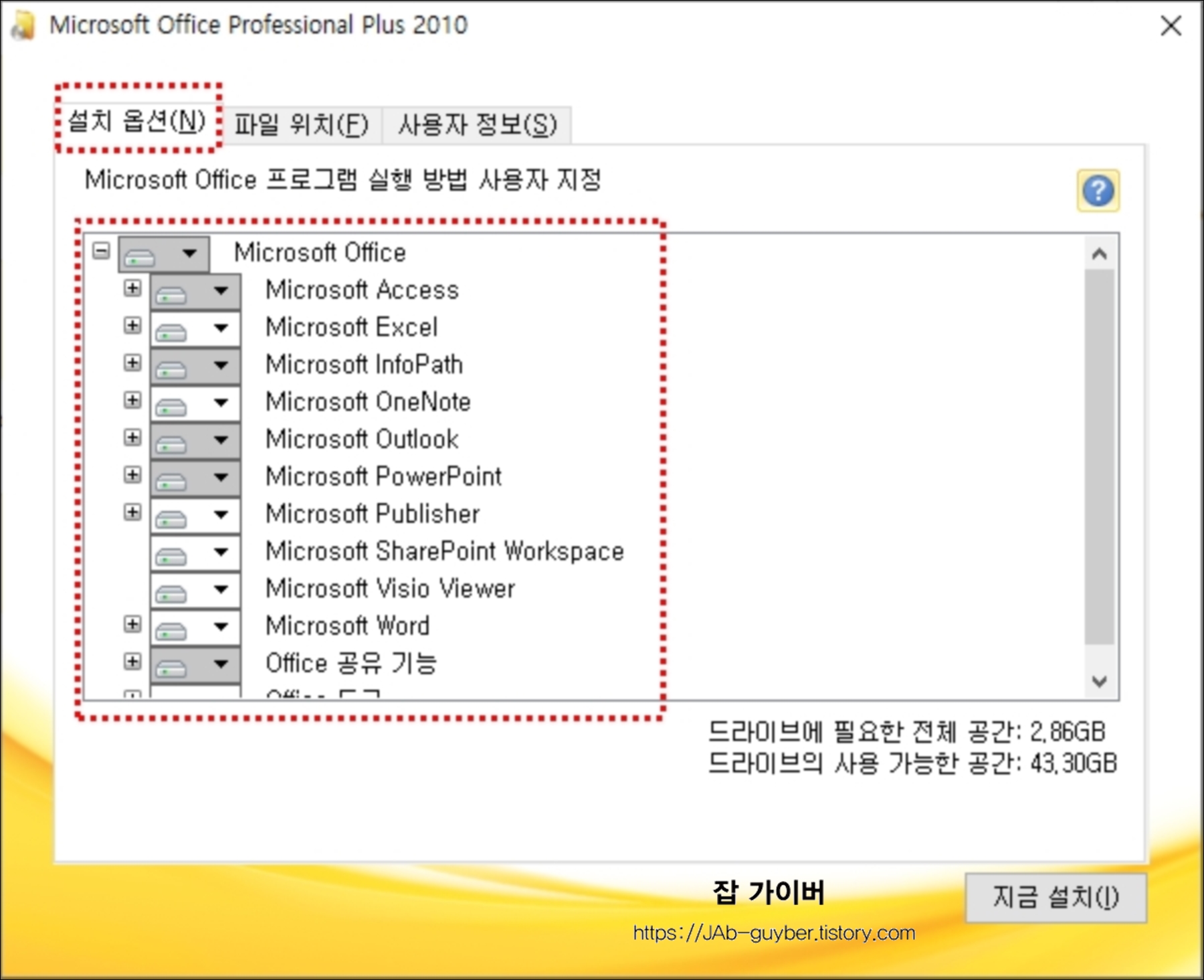 설치는 지금설치와 사용자 지정 두가지가 가능하며 사용자 지정을 통하면 보다 디테일한 설정이 가능합니다.