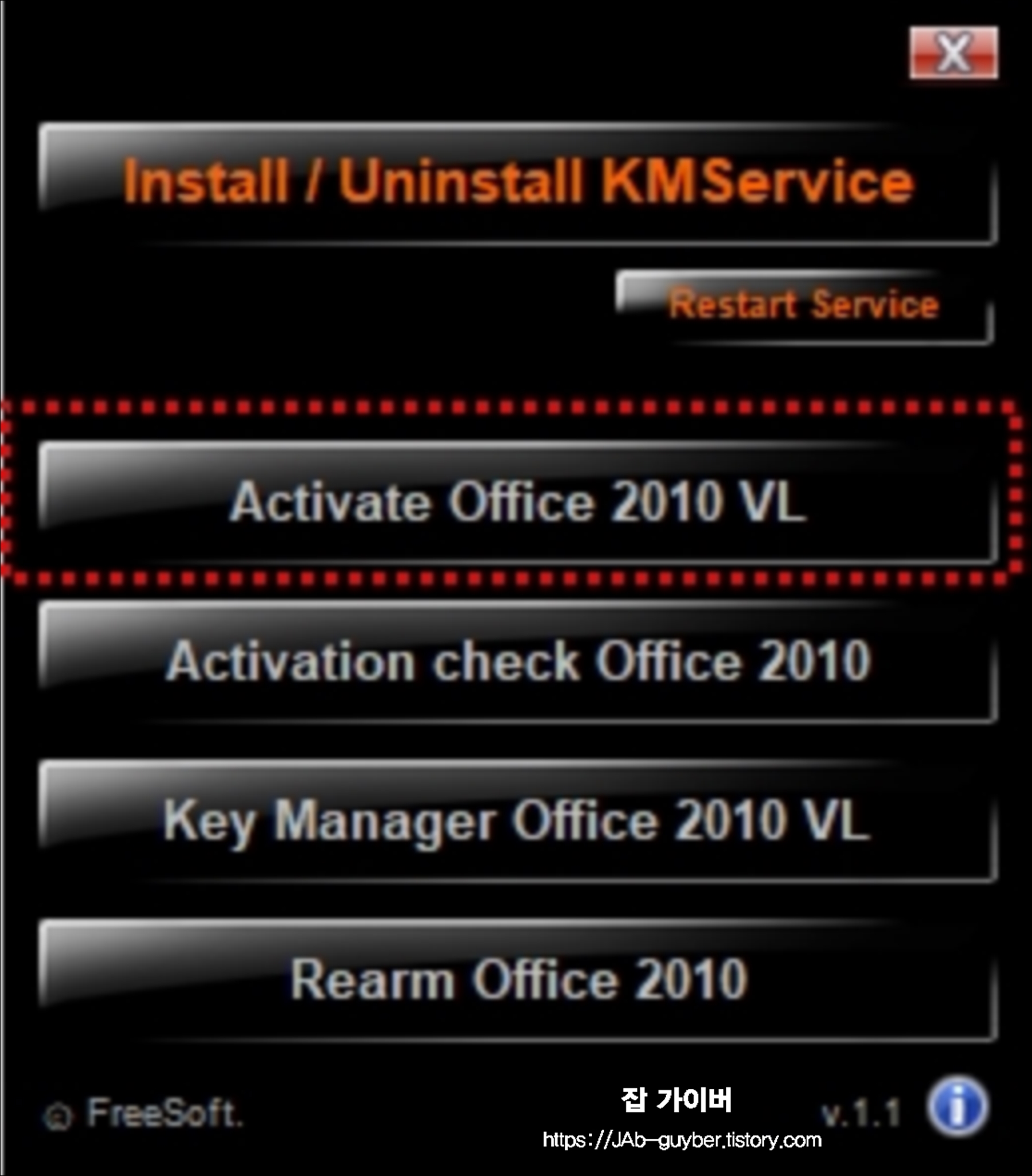 - KMS 인증 툴 사용: KMS 인증 툴을 이용해 정품인증을 시도합니다. KMS 툴을 실행하고 "Activate Office 2010 VL"을 클릭한 후, 1번을 눌러 활성화합니다.