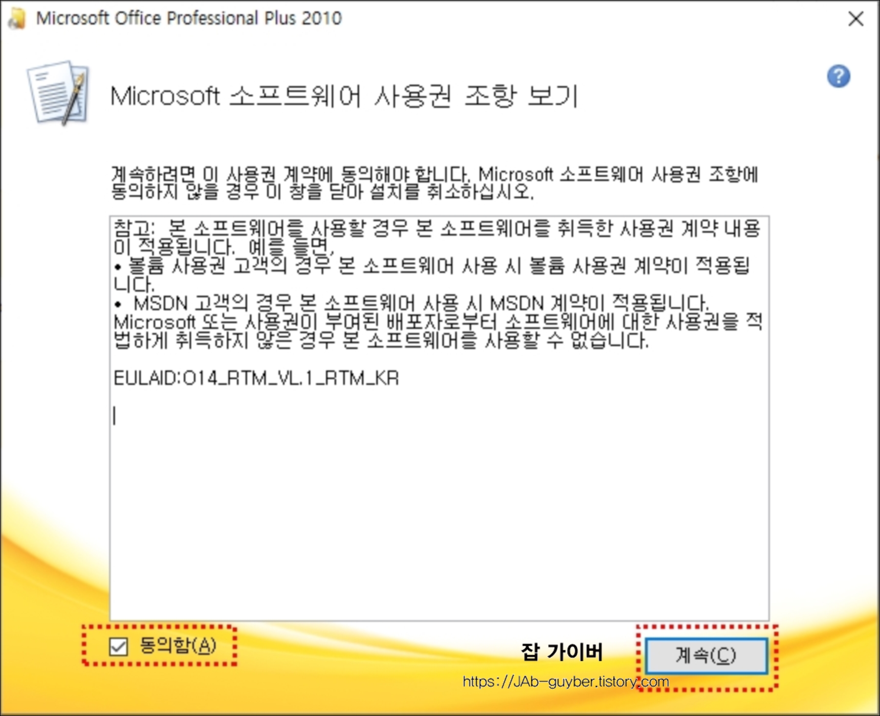 설치에 앞서 소프트웨어 사용권 조항에 동의를 하고 계속 눌러줍니다.