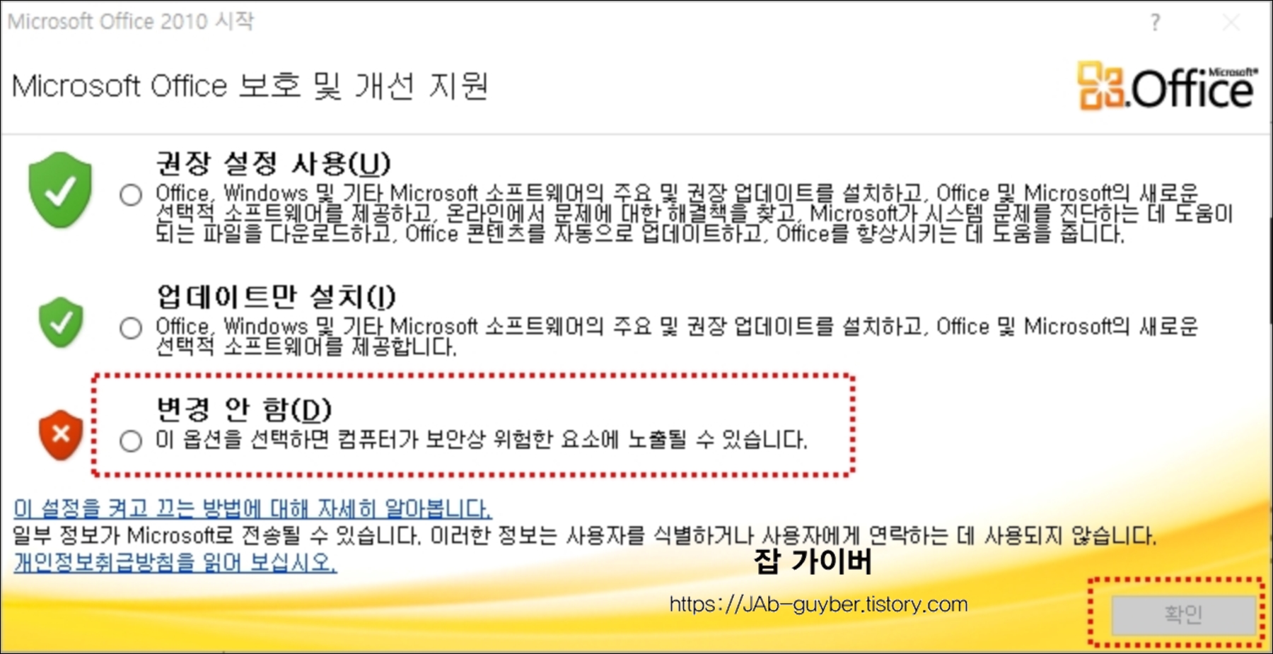처음 프로그램을 실행시 보호 및 개선지원으로 업데이트설정을 할 수 있으며 정품사용자가 아니라면 업데이트를 하지않느것이 좋습니다.