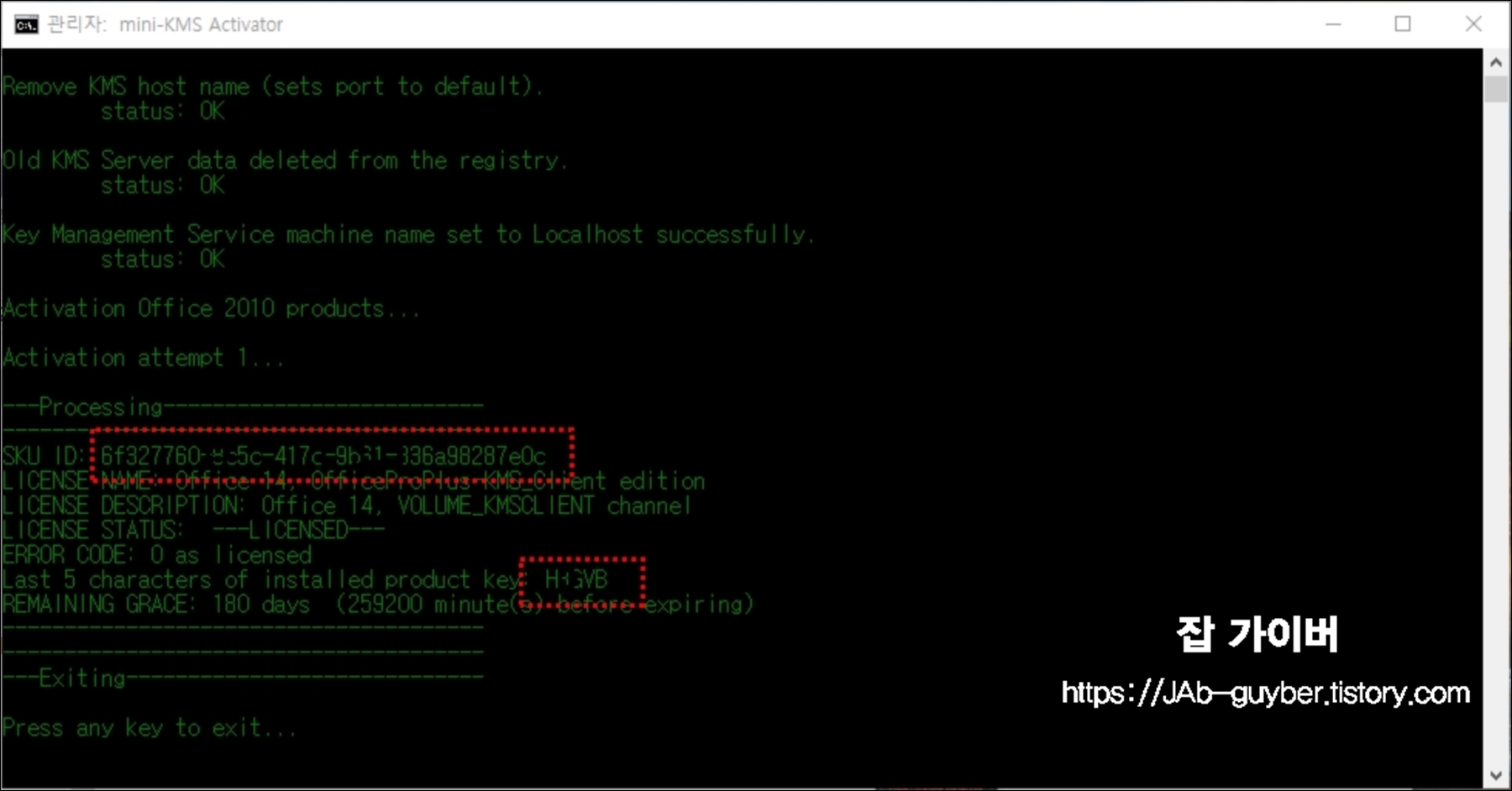 상단에 있는 Acivate Office 2010 VL을 선택하면 작은 MS도스창이 실행됩니다.
