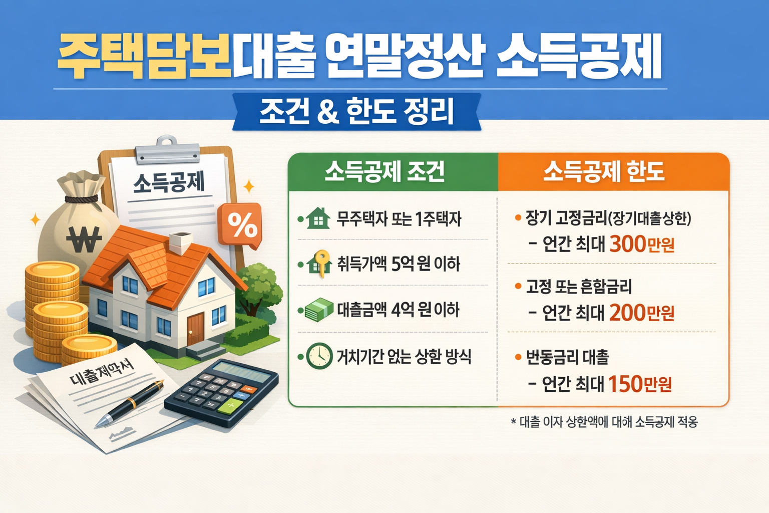 지금 기준으로는 취득 당시 기준시가 6억원 이하 요건과, 연간 공제 한도 최대 2,000만원 구간이 핵심입니다. 다만 “얼마나 공제되느냐”는 대출 형태(고정/변동, 거치 여부, 분할상환 등)와 상환기간에 따라 갈립니다.