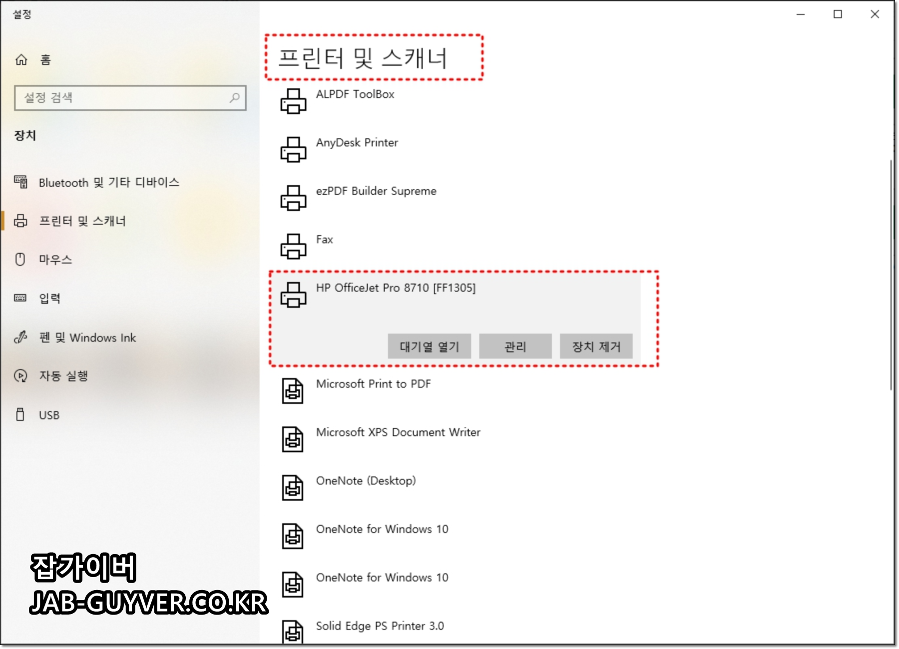 - 장치관리자에서 프린터 드라이버 업데이트 또는 장치 제거